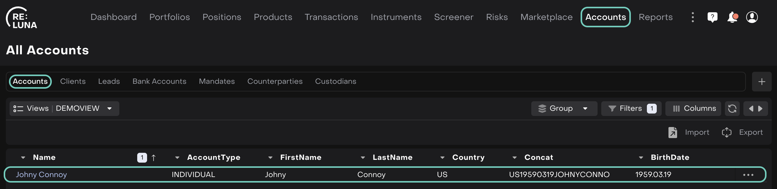 Client | An individual or entity stored in the platform, linked to one or more Accounts. |