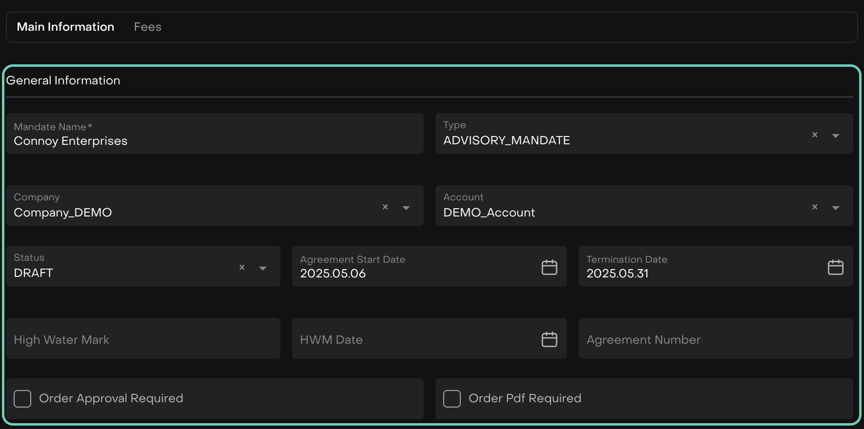A Mandate is a formal agreement associated with an Account that defines: