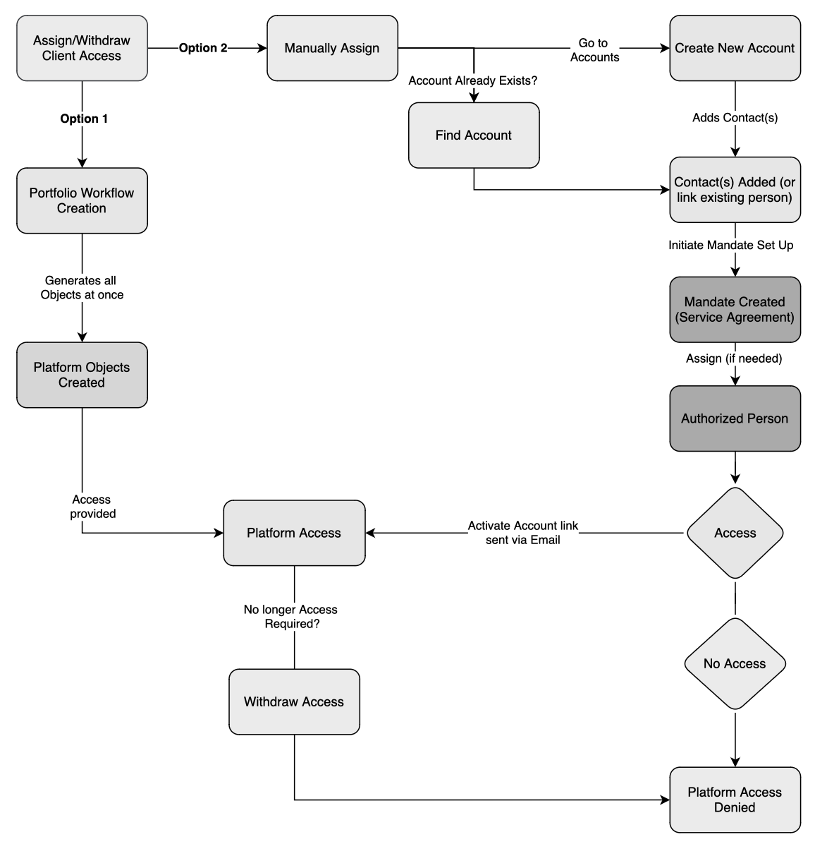 The platform supports two distinct methods for assigning or withdrawing client access, each suited to different operational needs. The flowchart outlines the two access methods.