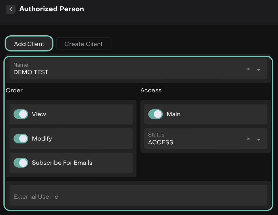Authorized Person | A Client assigned to a Mandate who can view, modify, or execute orders. |