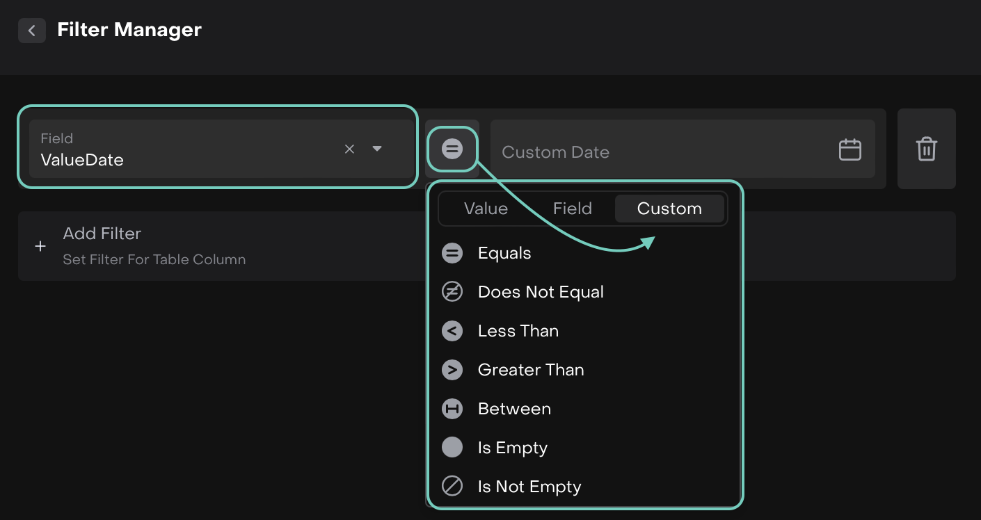 Click on the operator (such as Equals) and select Custom.