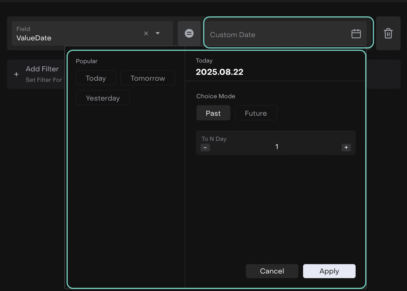 Click Apply to activate the filter or Cancel to go back.