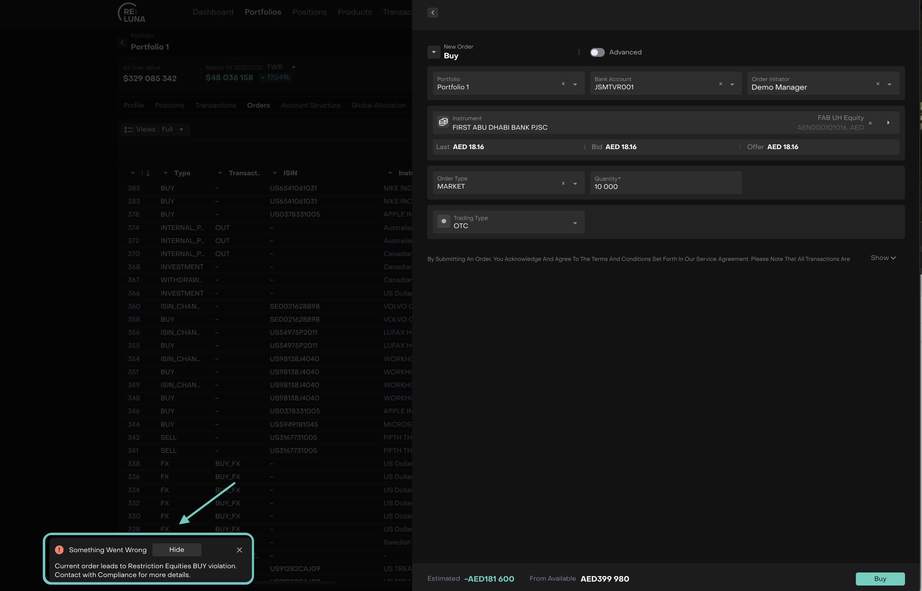 When you enable this option, any instruments with 0% restrictions will be hidden from your clients when they search during order creation. Your clients will only see instruments that are eligible for trading under the Investment Profile (those with no restriction or more than 0% allowed).