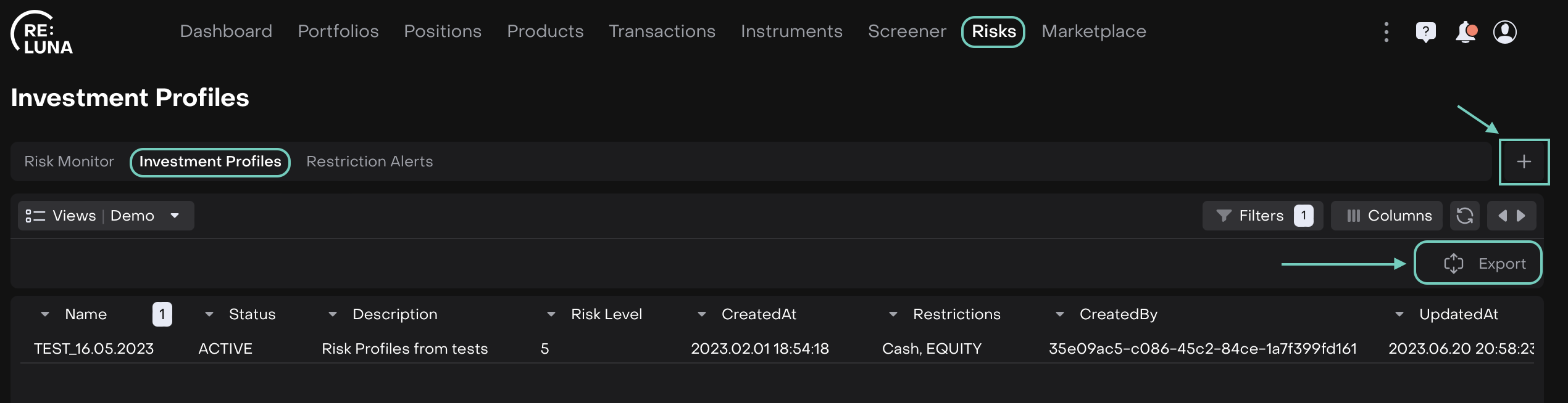 Investment Profiles are created and managed under: Risks > Find Investment Profiles tab.