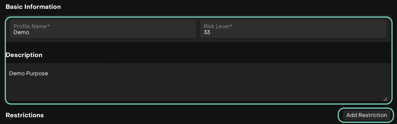 A form opens. Fill in Profile Name(*), a unique Risk Level(*) from 0-100 and Description.