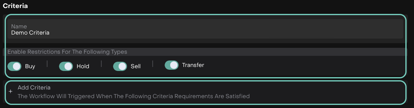 Fill in the Name(*) and Enable Restrictions for the following types: Buy/Hold/Sell/Transfer and then, click on Add Criteria.