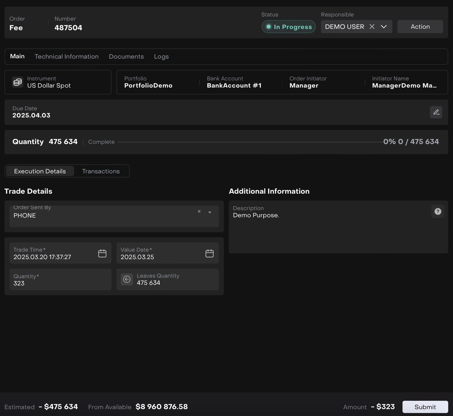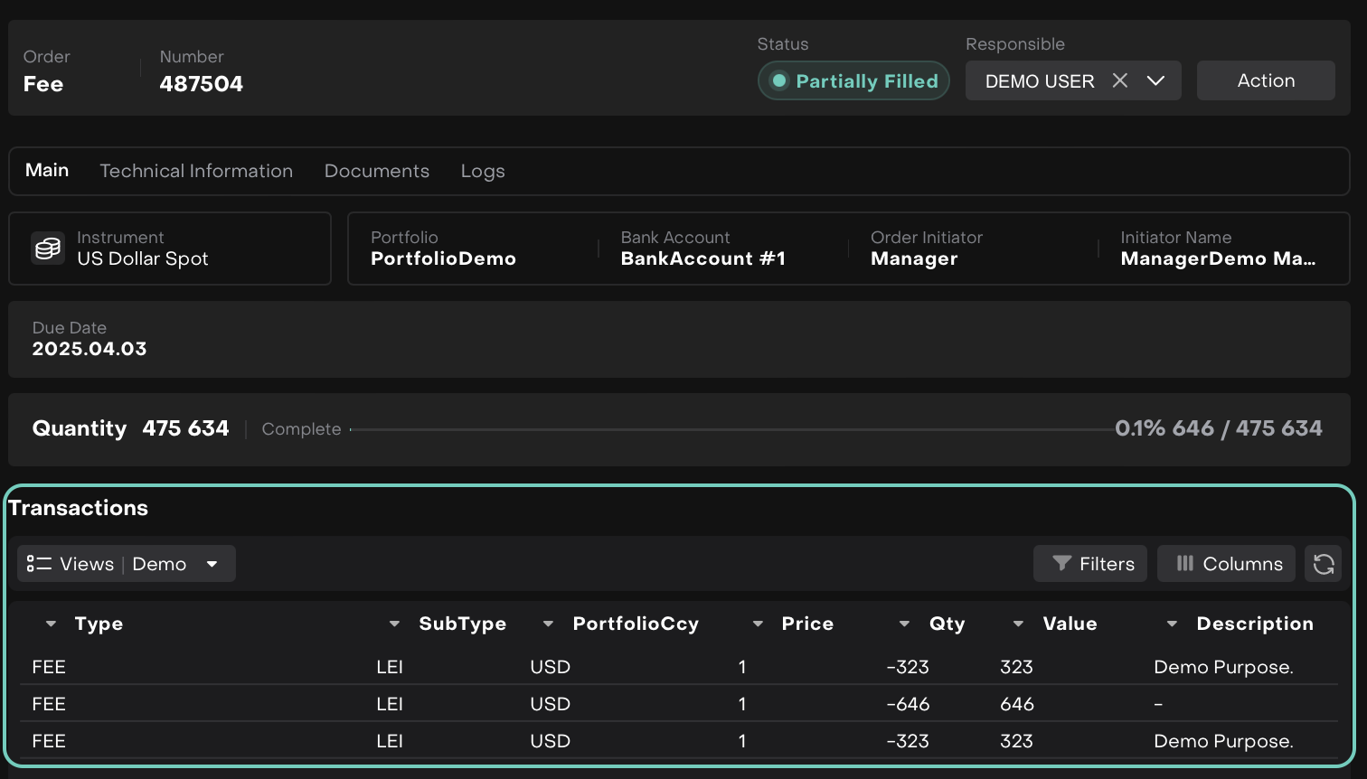 Once the order is created, execute the order to trigger the fee calculation.
