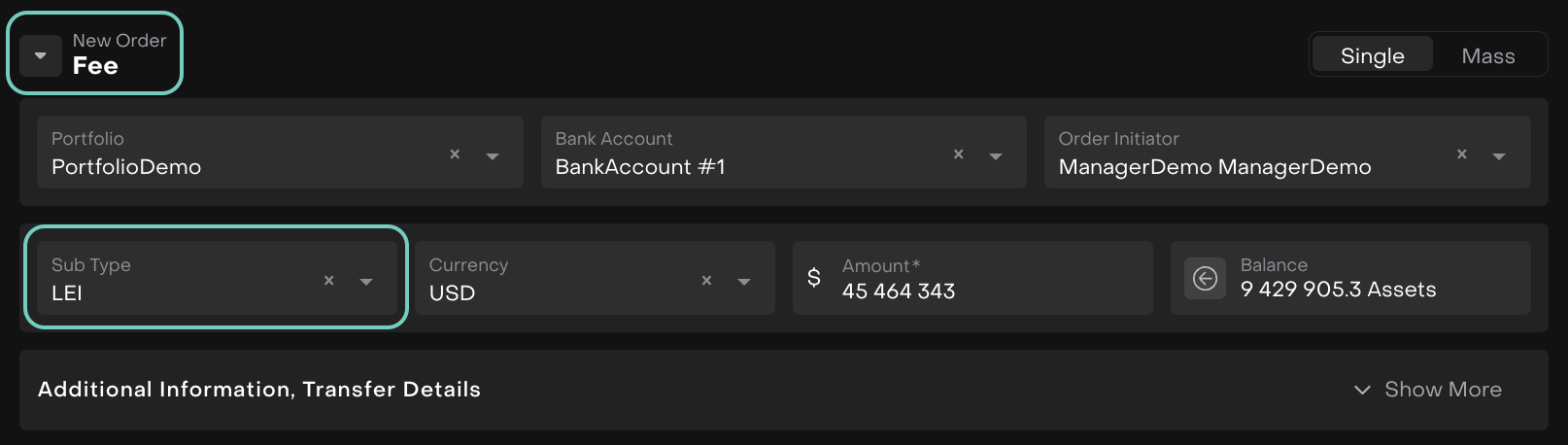 Select Create Fee Order, and choose LEI as the subtype.