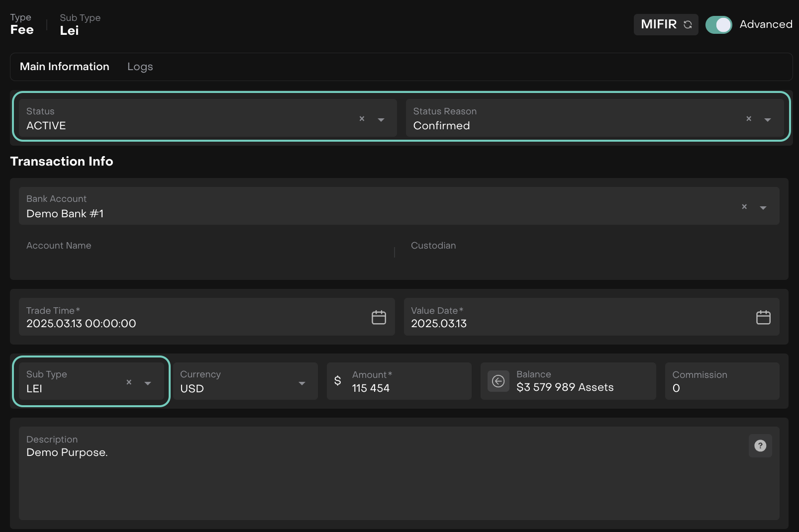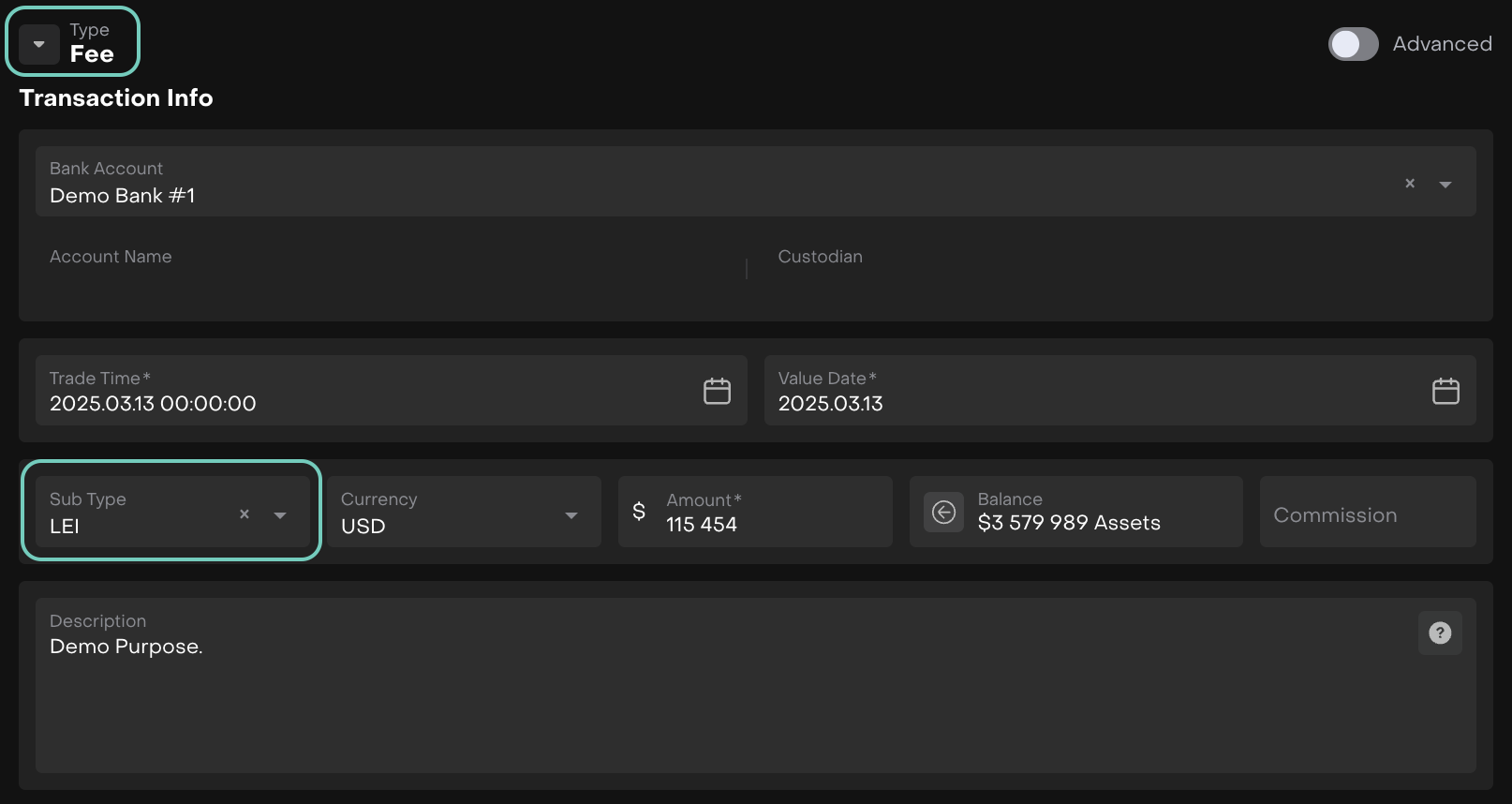 Navigate to Transactions and create a fee transaction under LEI sub type.