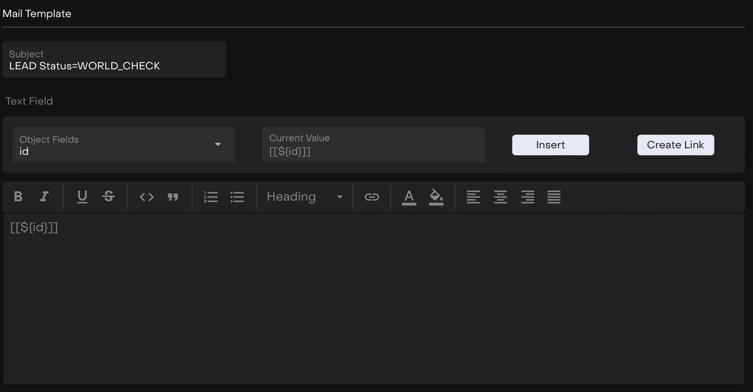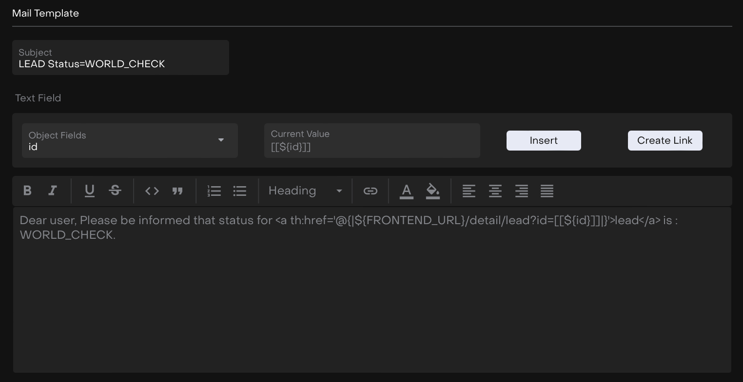 The Mail Template section allows you to design the content of the email notification that users will receive when the workflow is triggered. You can include dynamic placeholders and create custom links tied to object data.