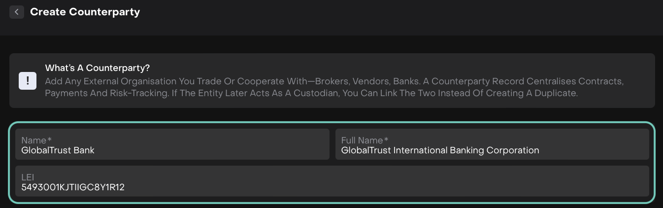 If you create a custodian later, you can link it back to this counterparty instead of creating a duplicate.
