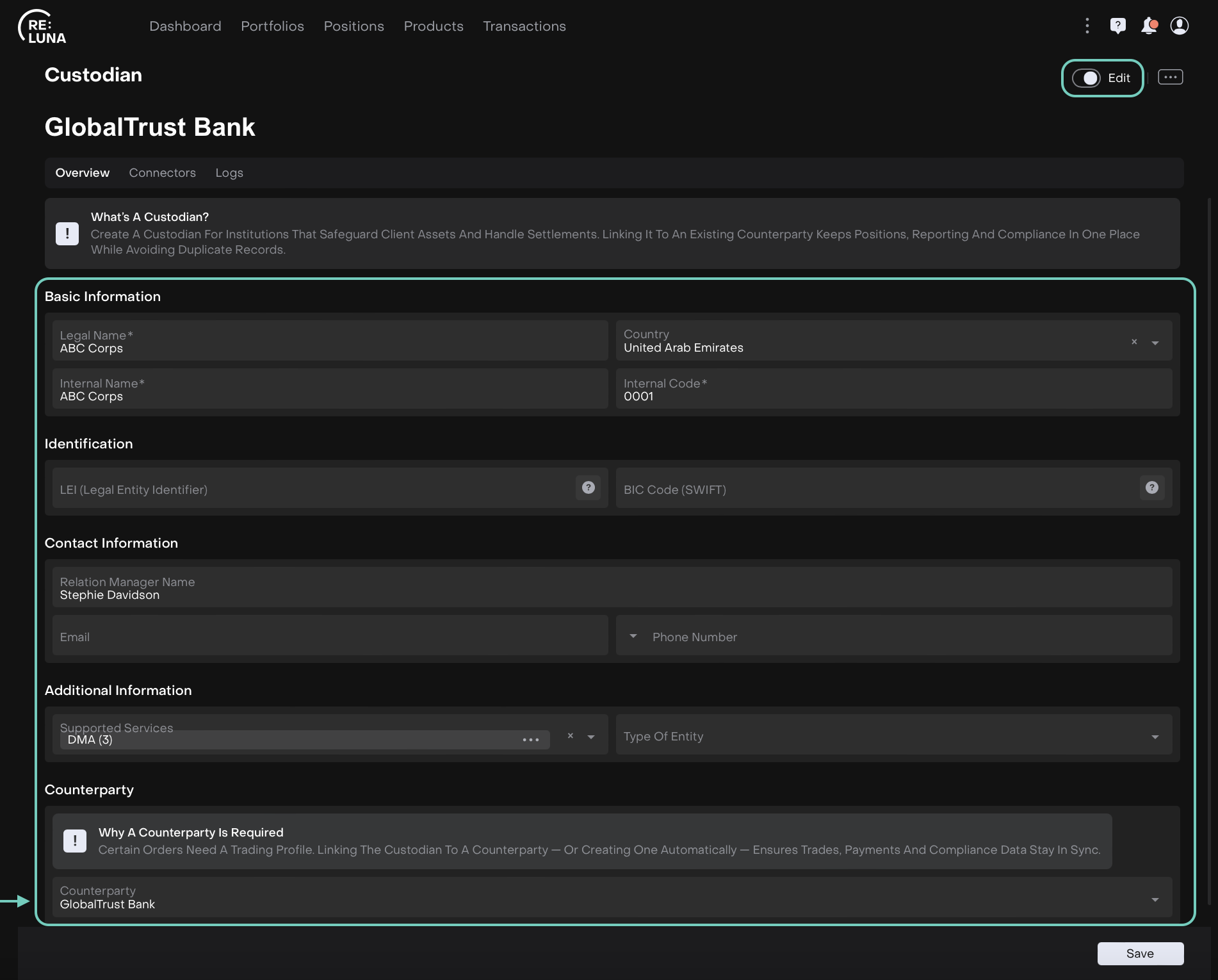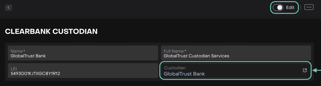 Once you edit a counterparty, an additional field appears: Custodian.