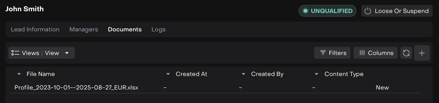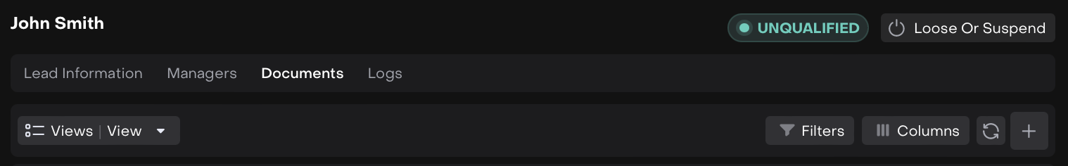 Documents | Tab where scanned documents and uploaded files related to the lead are stored. |