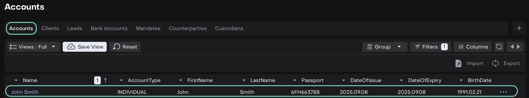 Account | A finalized and qualified record of a client created after lead screening. |