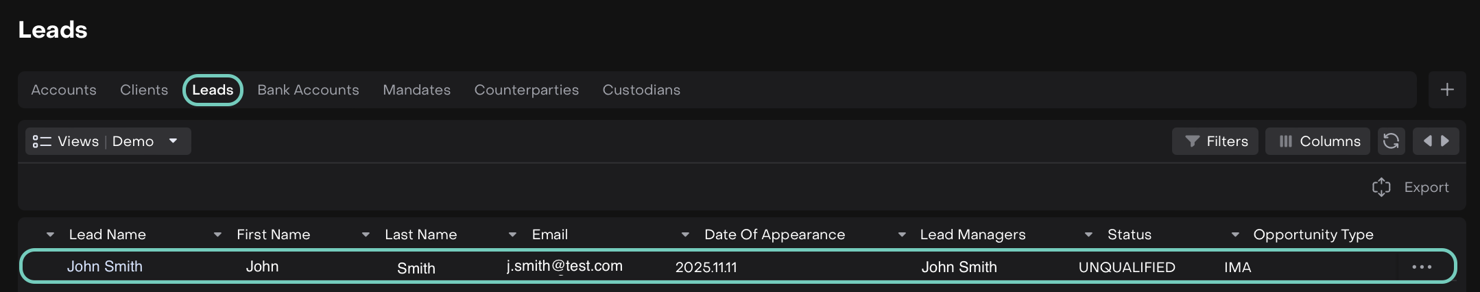 Lead | A record representing a potential client in the platform. |