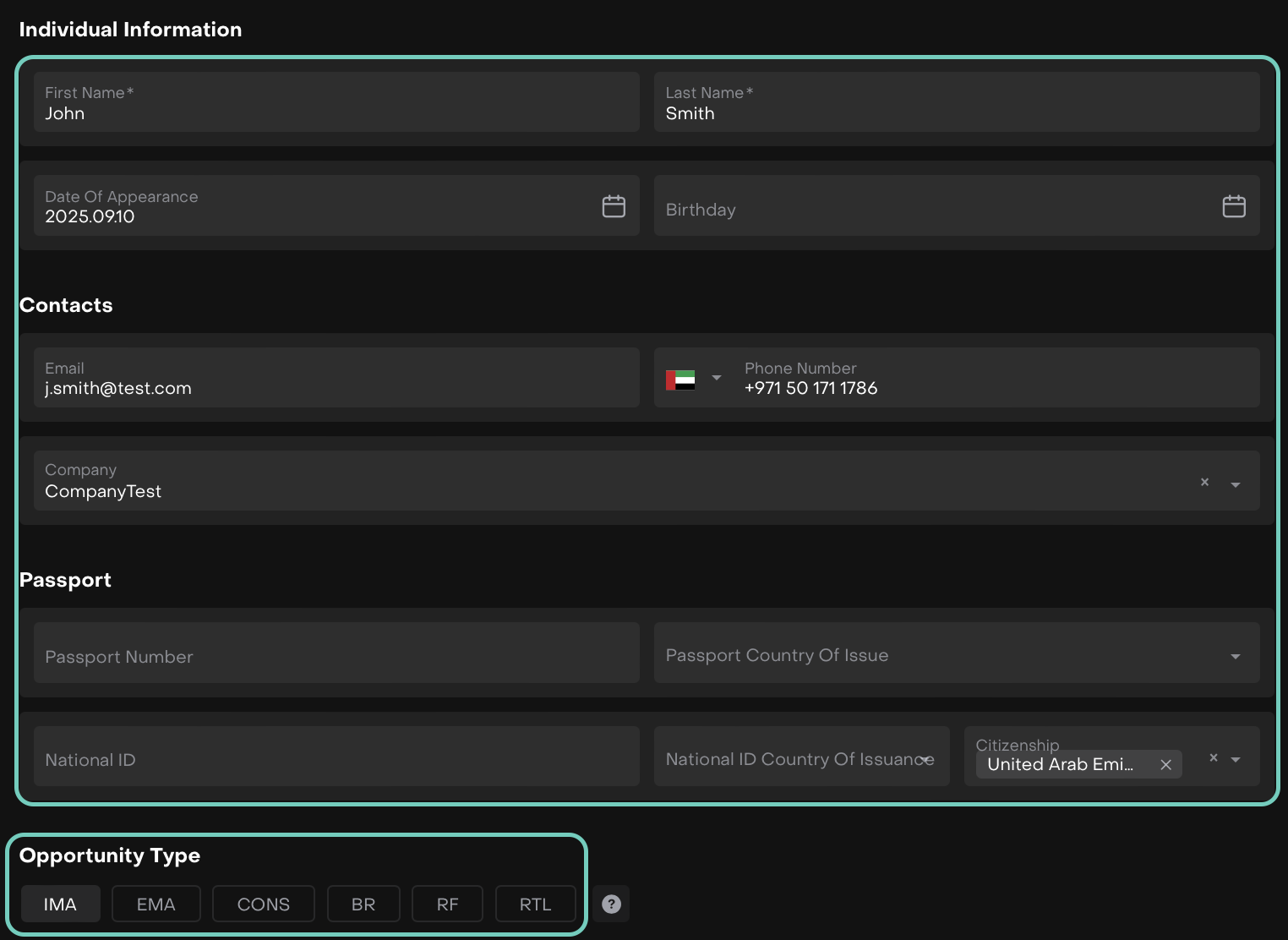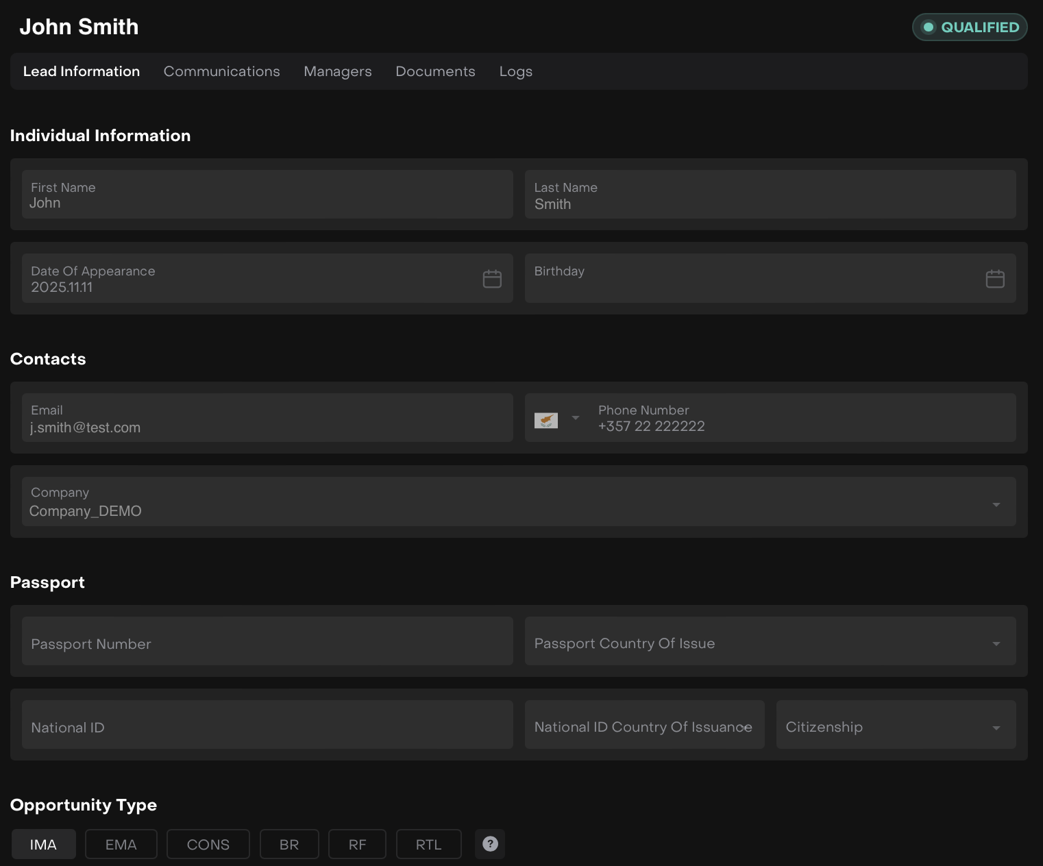 Opportunity Type | Classification of the lead (IMA, EMA, BR, RTL - Internal Management Agreement/Retail). Selected during creation. |