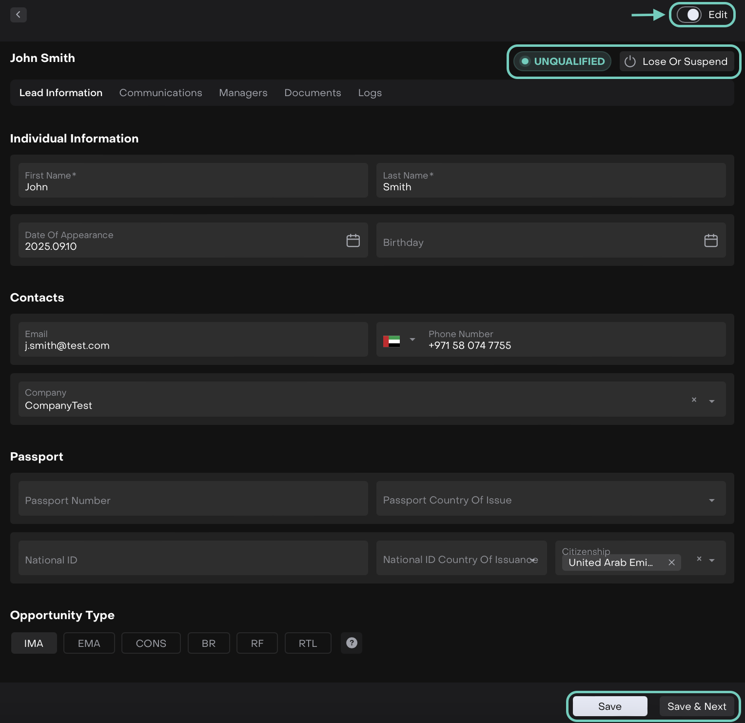 Once edits are complete, click Save & Next to advance the lead to the next status, or click Save to stay on the current status.