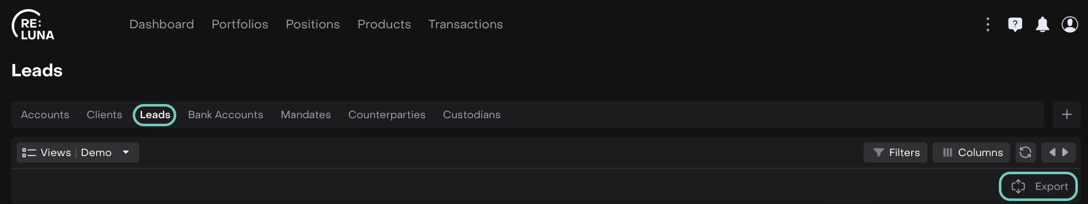 Use the Export button to view or manage all listed leads.