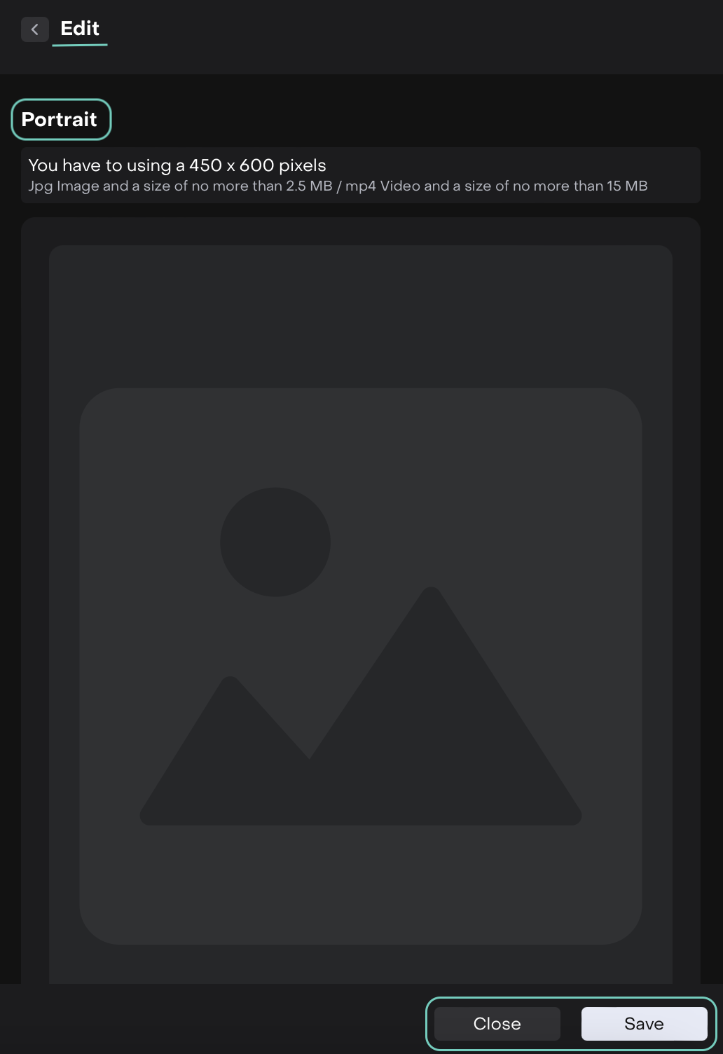 Portrait: 450×600 pixels JPG (≤2.5 MB) or MP4 video (≤15 MB).
