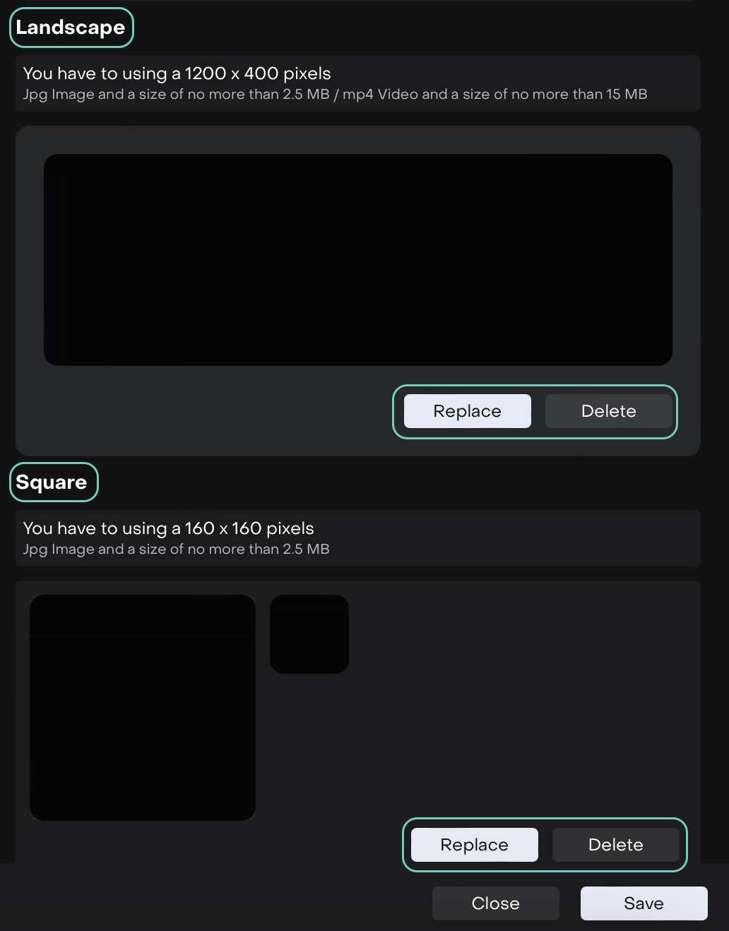 Landscape (Main Cover Preview): 1200×400 pixels JPG (≤2.5 MB) or MP4 video (≤15 MB)