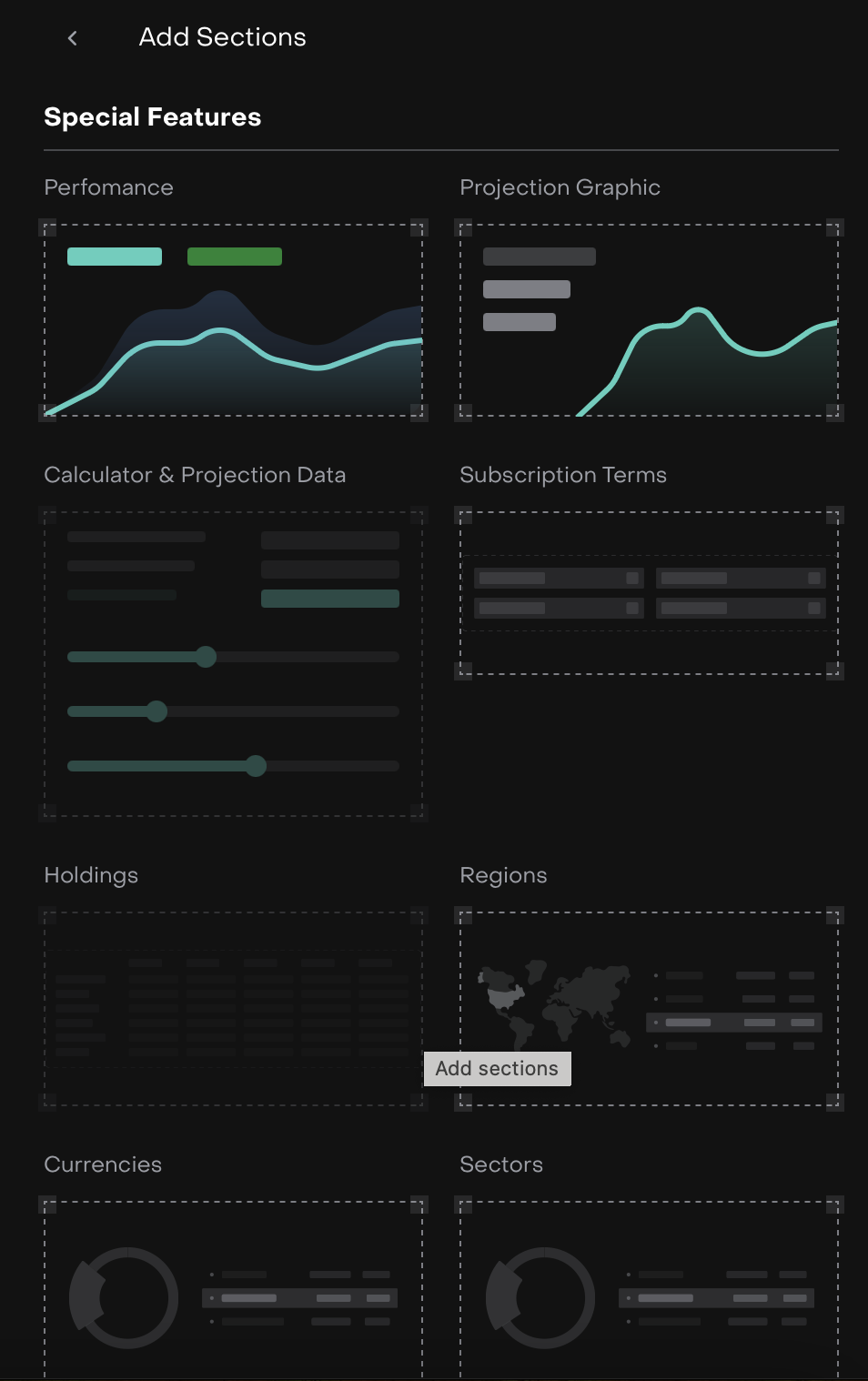 Add sections opens from the sidebar, simply drag and drop the section type you want.