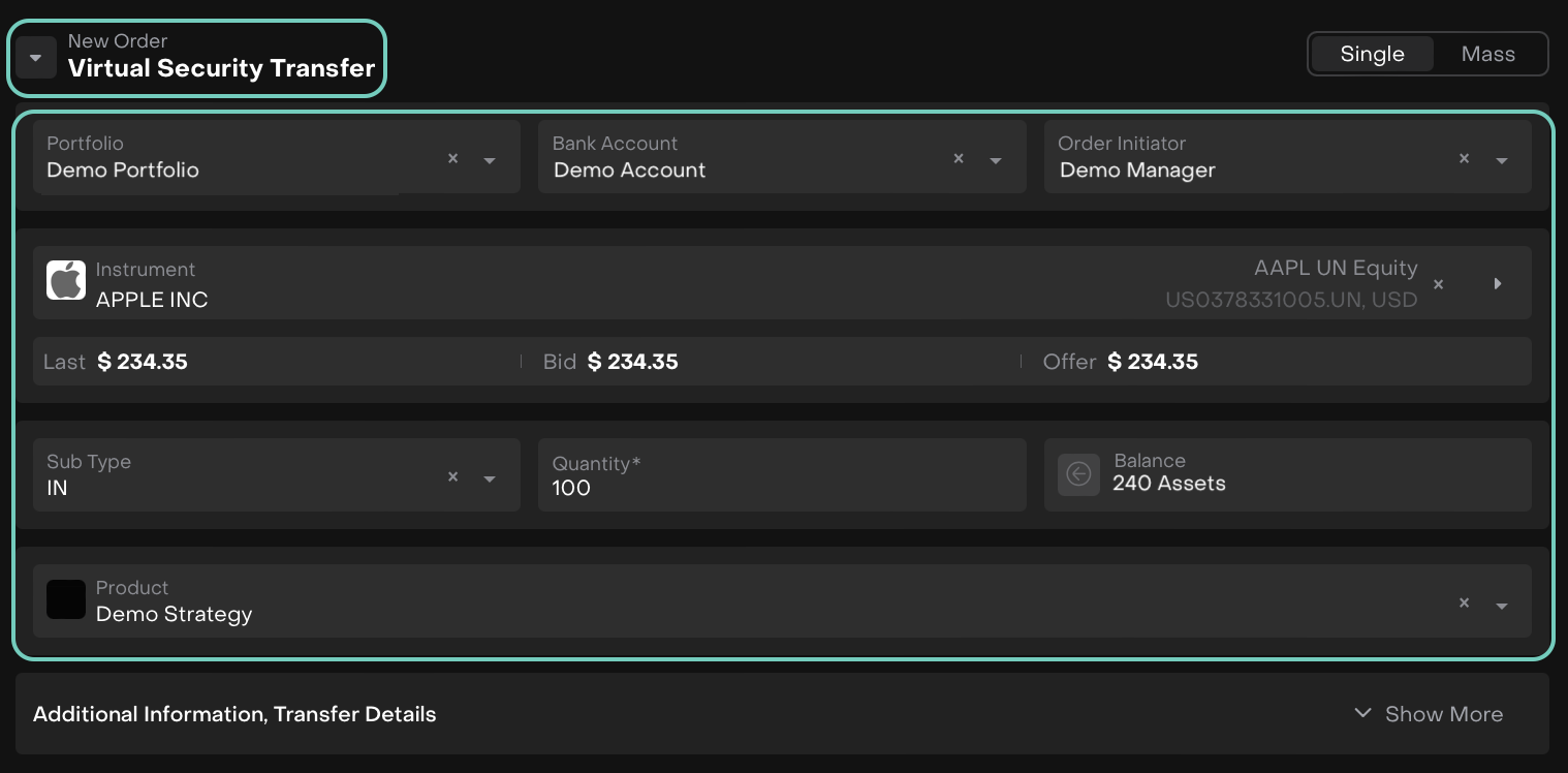 Virtual Security Transfer orders can only be executed in full quantity, not partially.