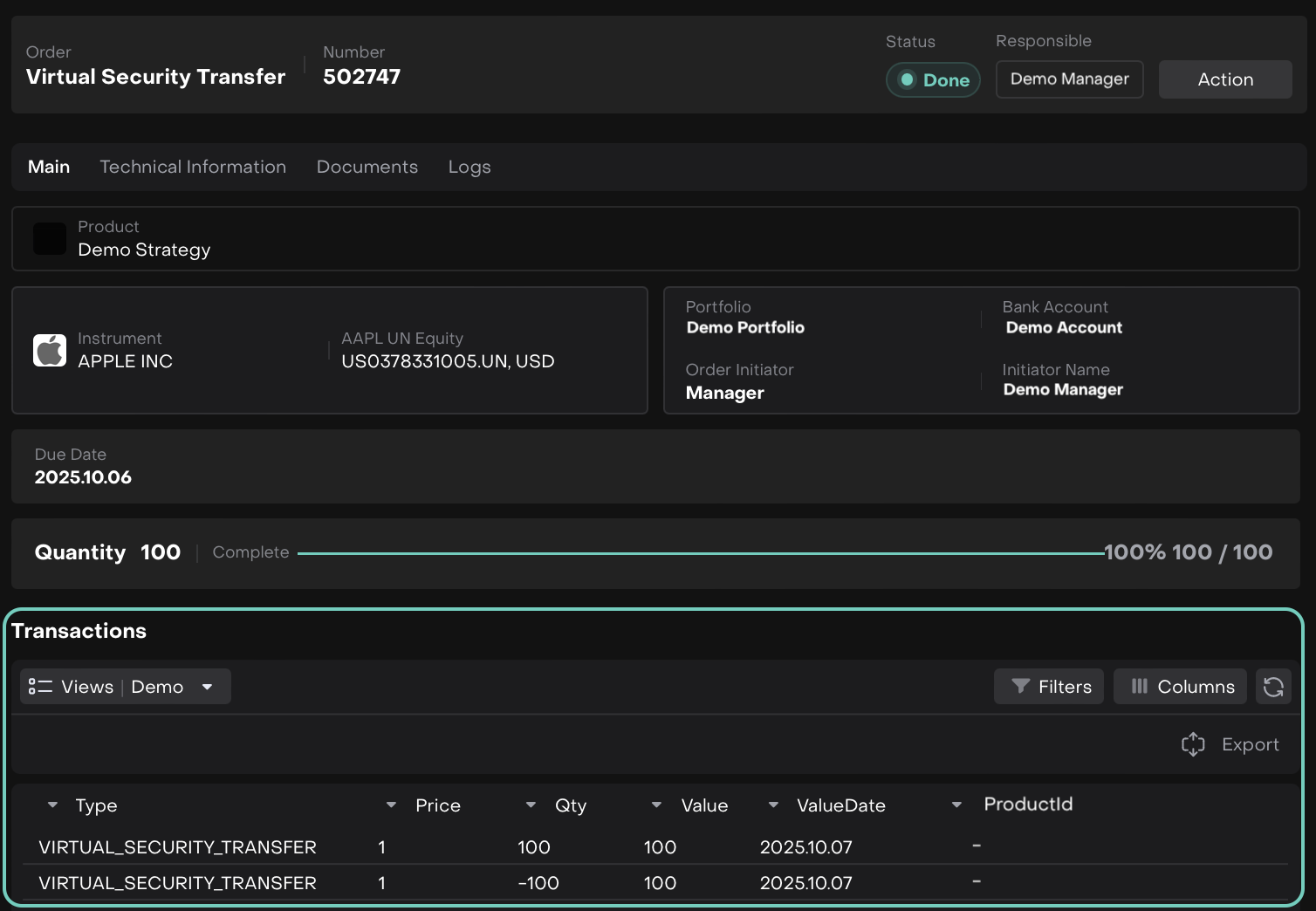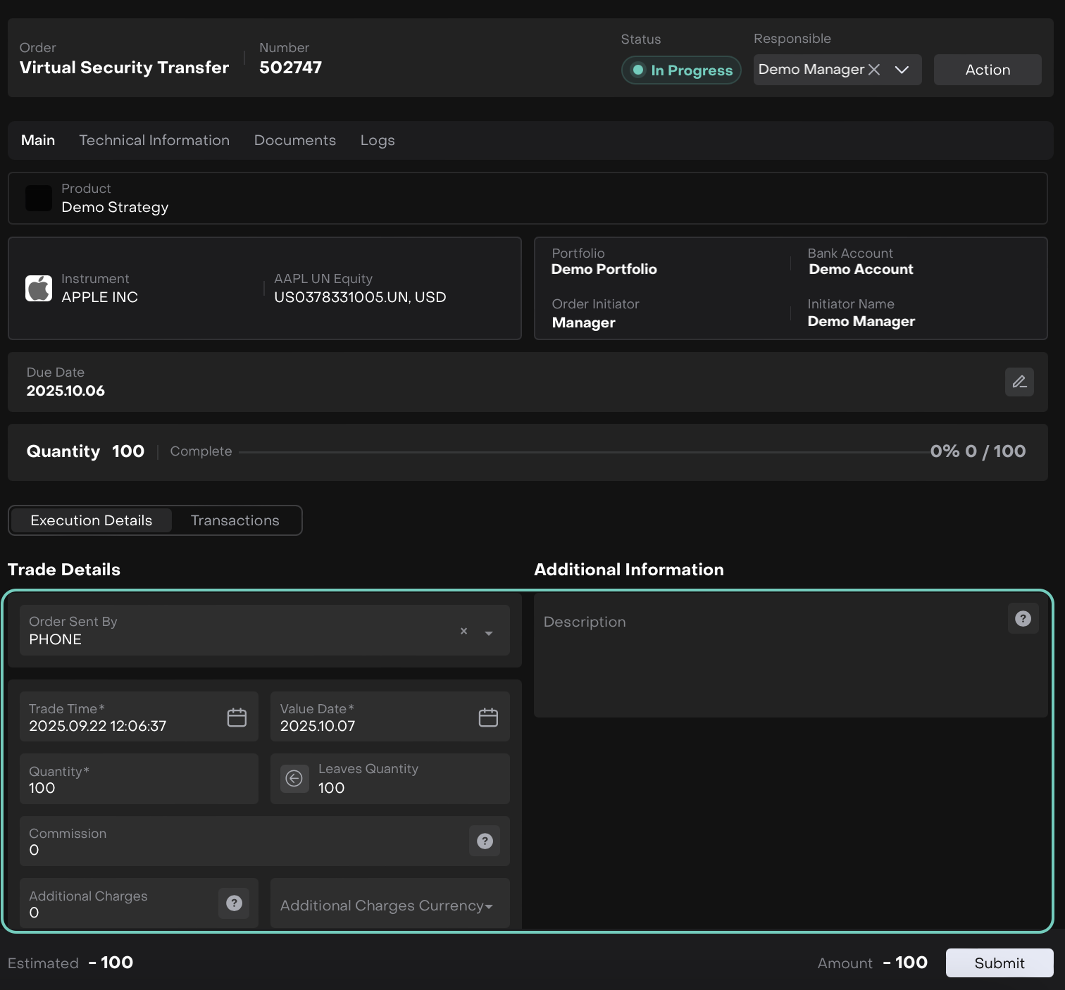 Full Quantity Execution | Execution of a virtual security transfer order for the total quantity specified; partial execution is not allowed. |