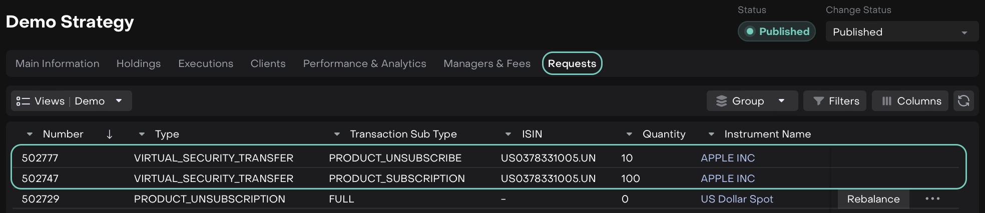 You can also verify the order status and related transactions under the Strategies > Requests tab.