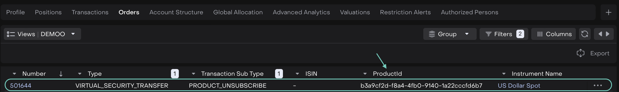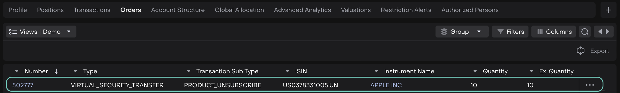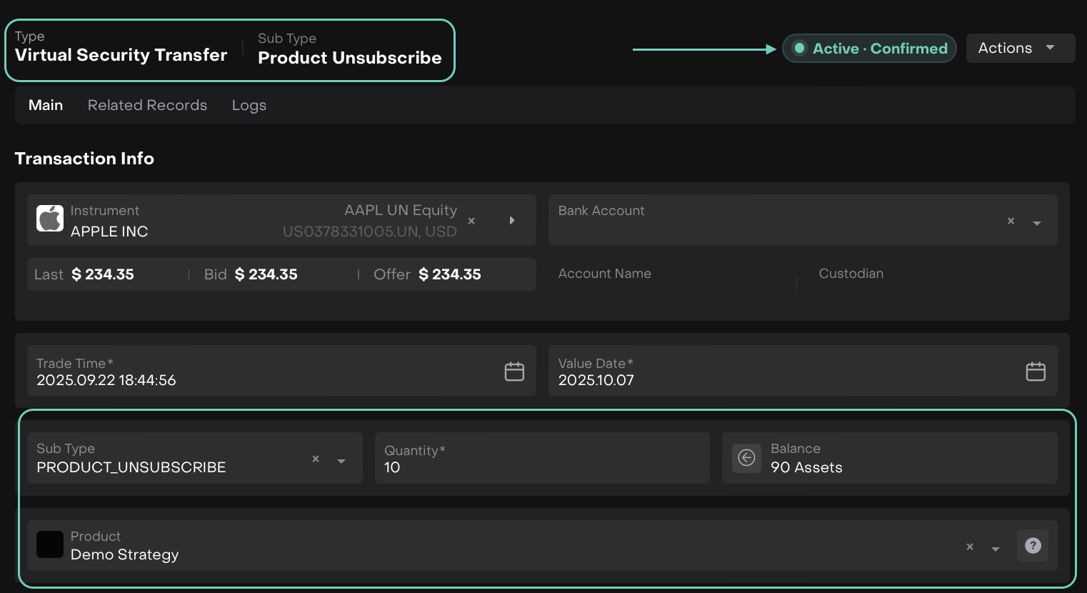 Product Unsubscribe | Securities withdrawn from the Strategy and moved back to the Bank Account (Sub Type = Out). |