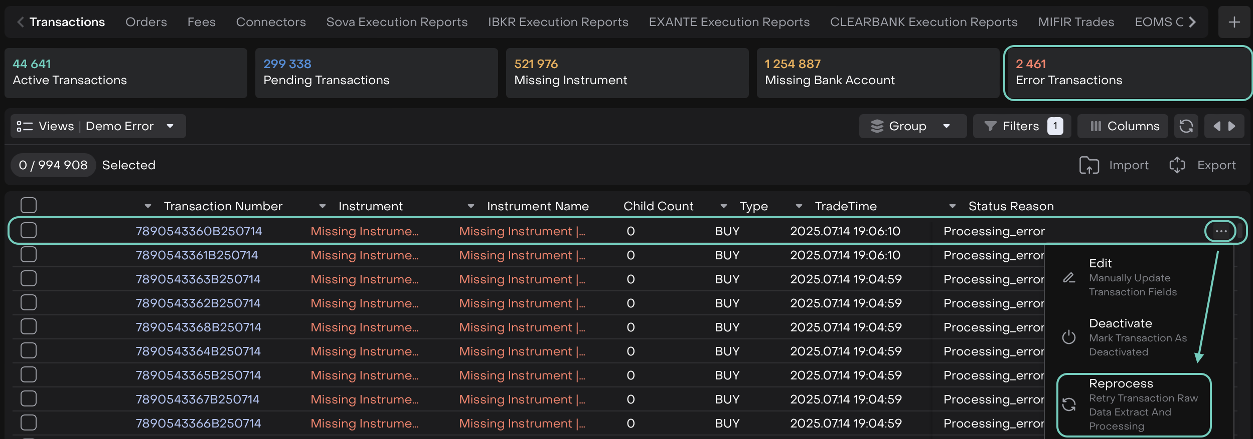 Click the three dots (⋯) next to the transaction and click Reprocess.