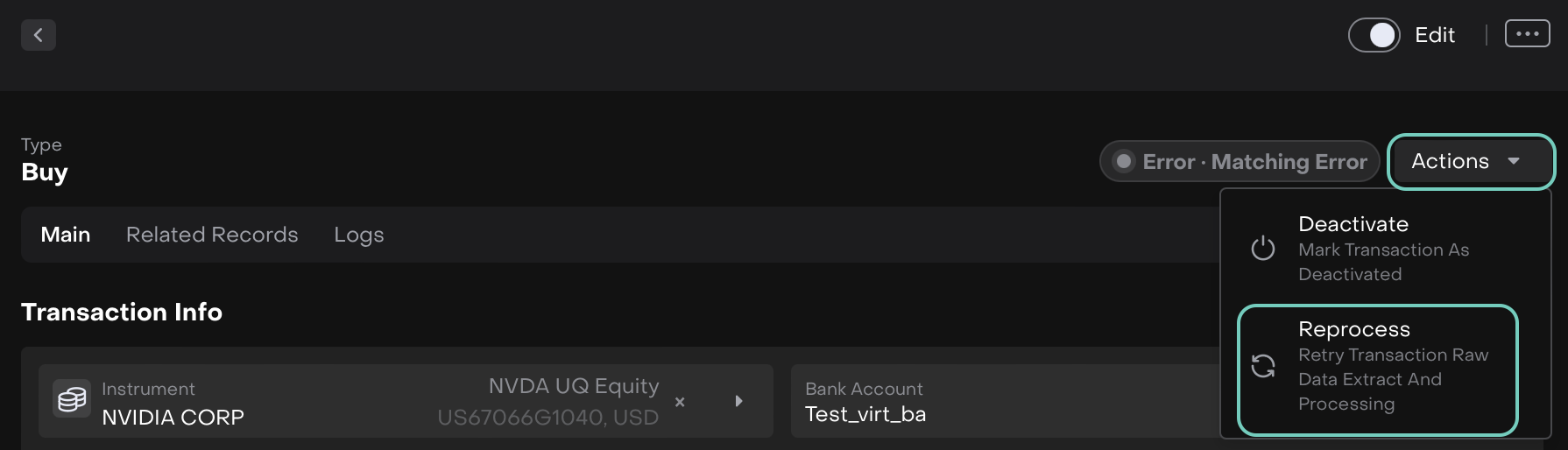 Toggle Edit to 'ON', then open the Actions dropdown and click Reprocess.