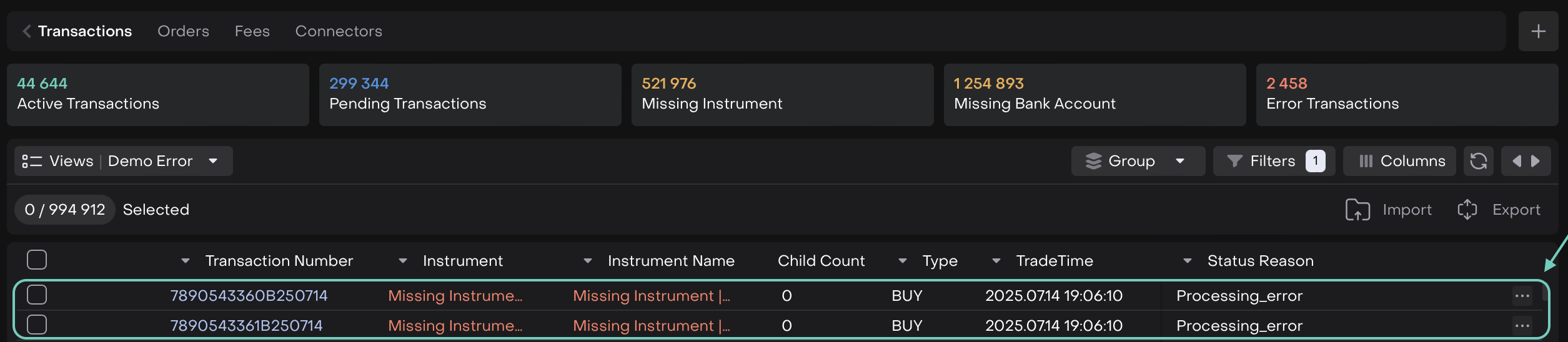 If you come across a transaction that has failed to process or match correctly – the platform gives you tools to fix it directly. You can either manually correct the missing details or reprocess the transaction.