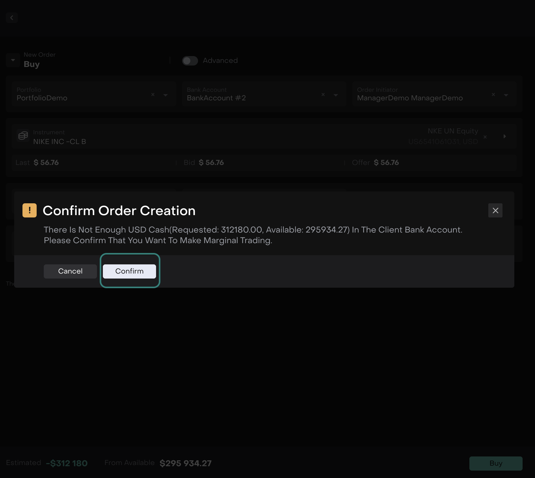 When attempting to place an order that exceeds the available cash balance, the system triggers a confirmation dialog titled "Confirm Order Creation".