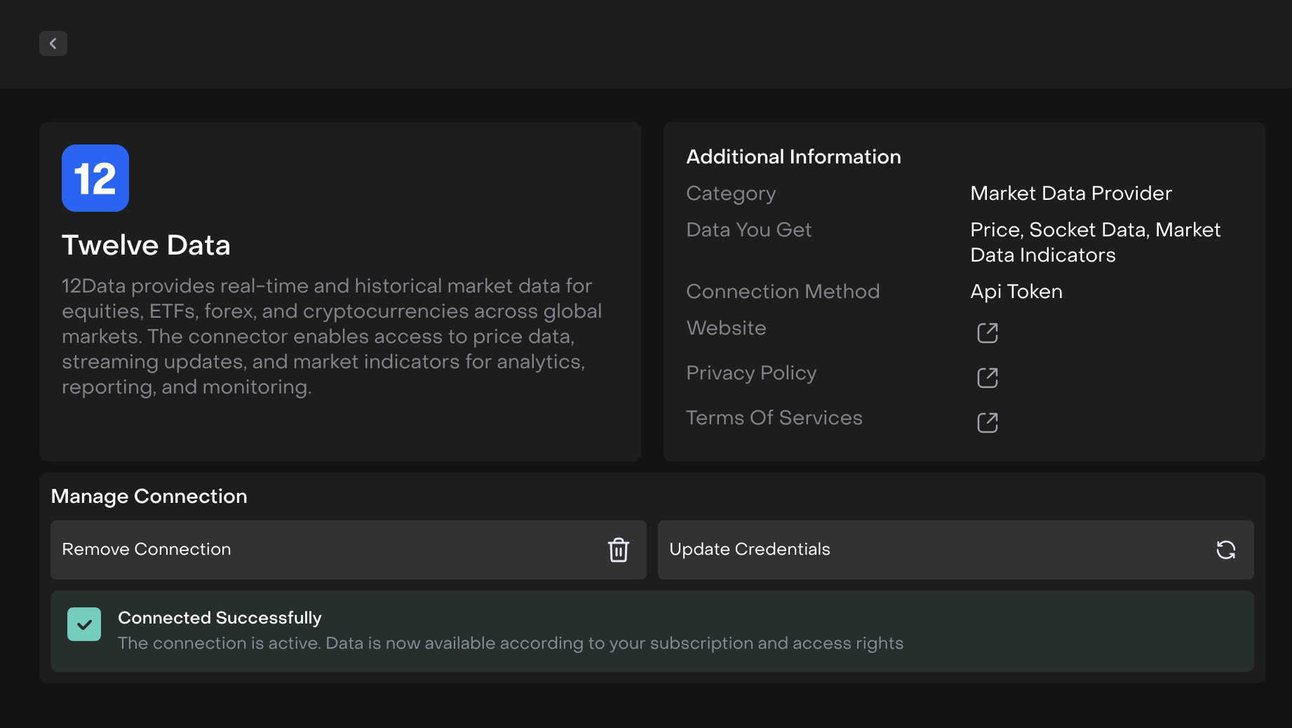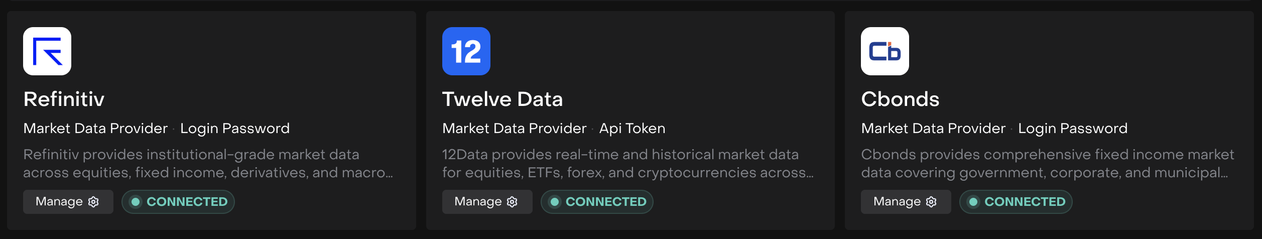 This guide will walk you through the steps to connect and manage market data providers in the platform. Market Data Connectors allow you to use your own market data provider subscriptions, giving you flexibility in choosing the right data sources for your investment workflow.