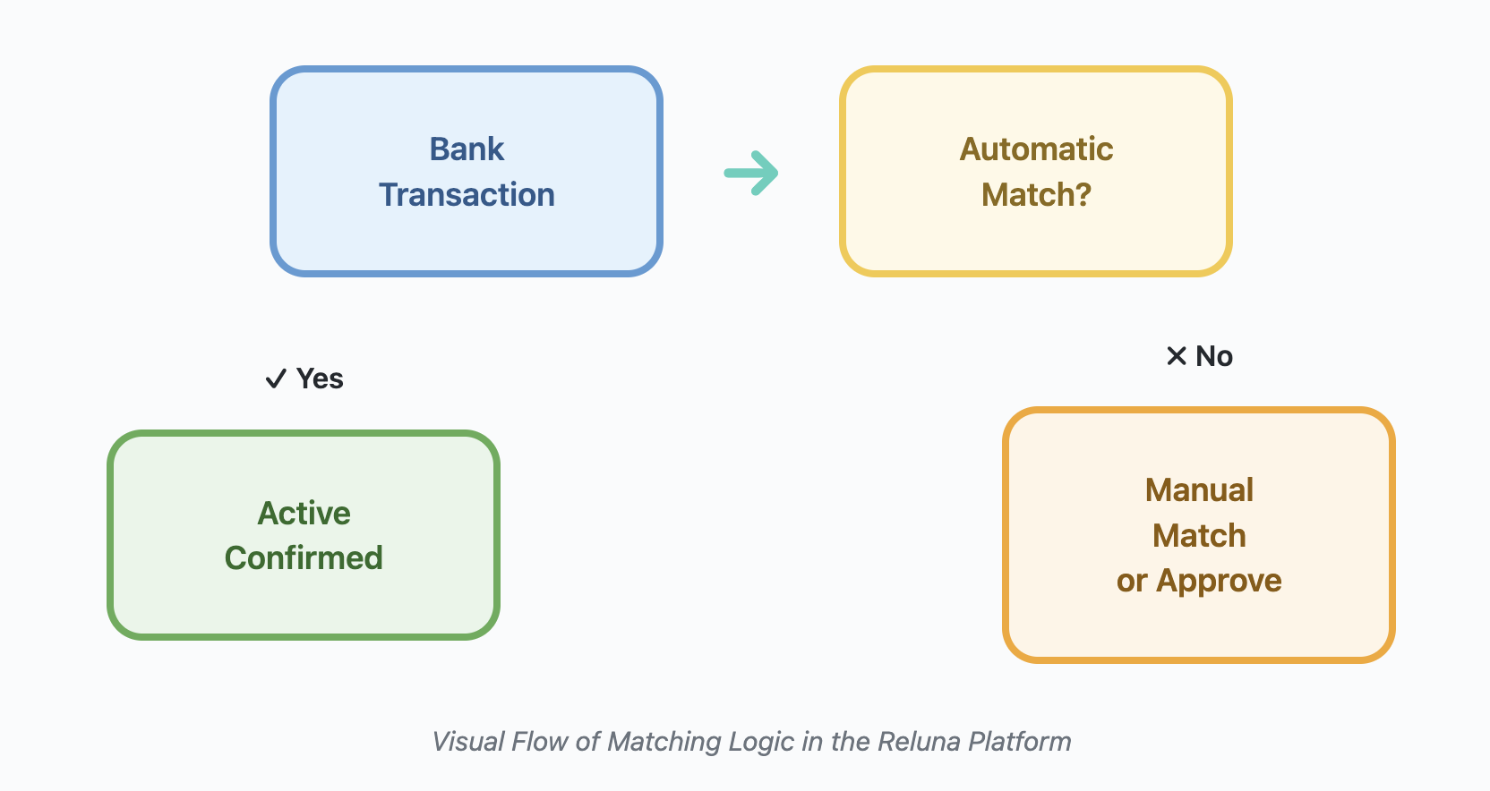 The Reluna platform includes a robust matching mechanism designed to reconcile transactions received from your bank with those generated internally after order execution. This ensures your records remain accurate, your portfolio positions stay updated and your reconciliation process is both efficient and auditable.