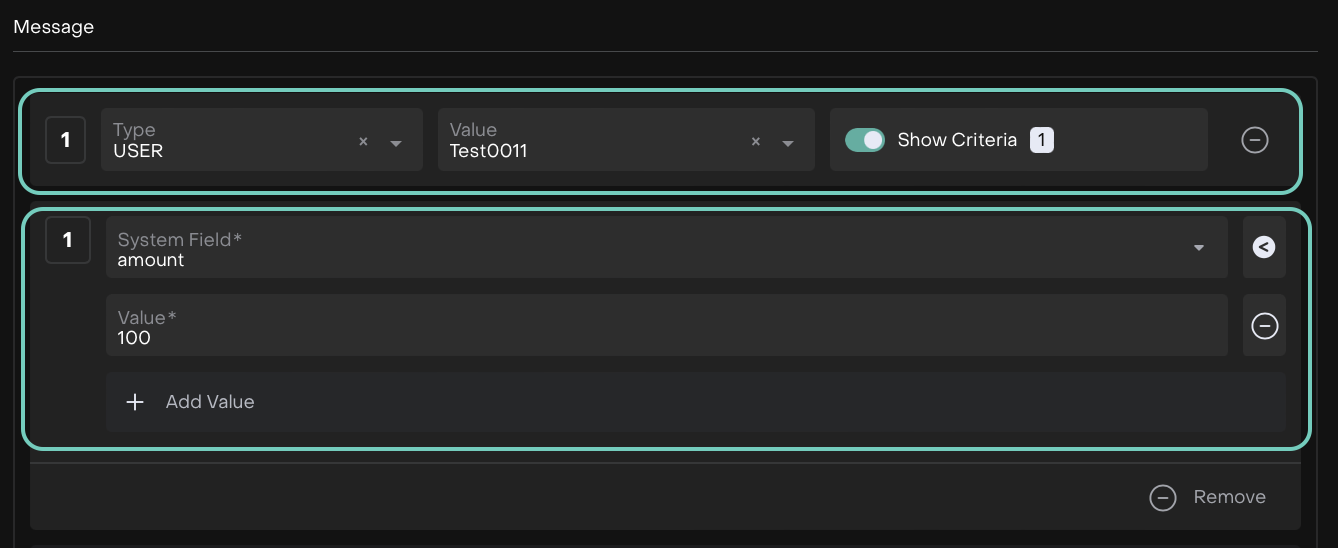 After entering your first condition, click the + icon to add more entries for the same recipient or system field.