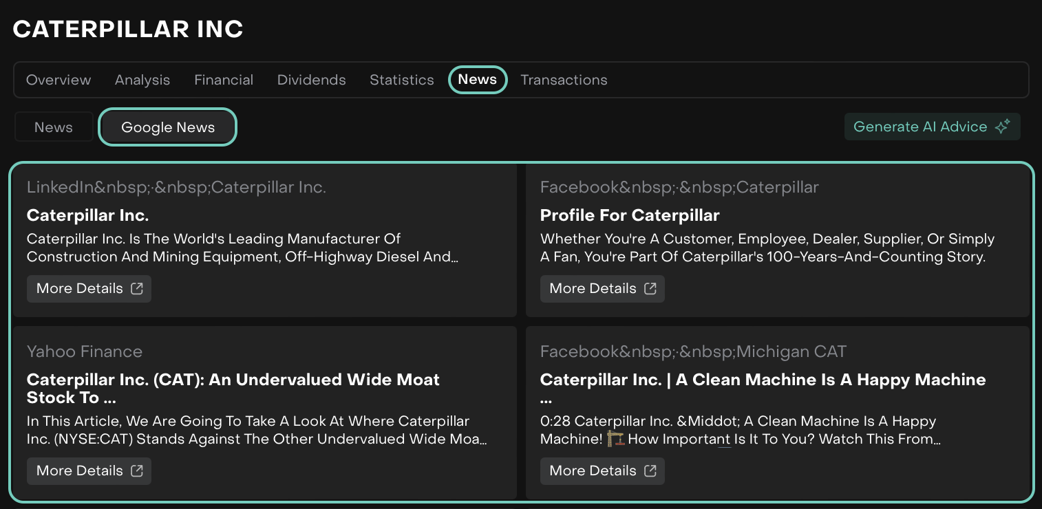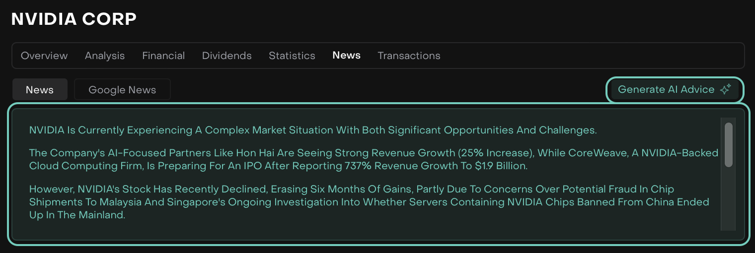 Example Use Case: "A portfolio manager is tracking Tesla's stock. Using the News tab, they see the latest updates on regulatory changes affecting the EV industry. Then, they check the AI Recommendation/Advice, which suggests adjusting the position based on recent performance trends. This integrated approach helps them make a well-informed decision."