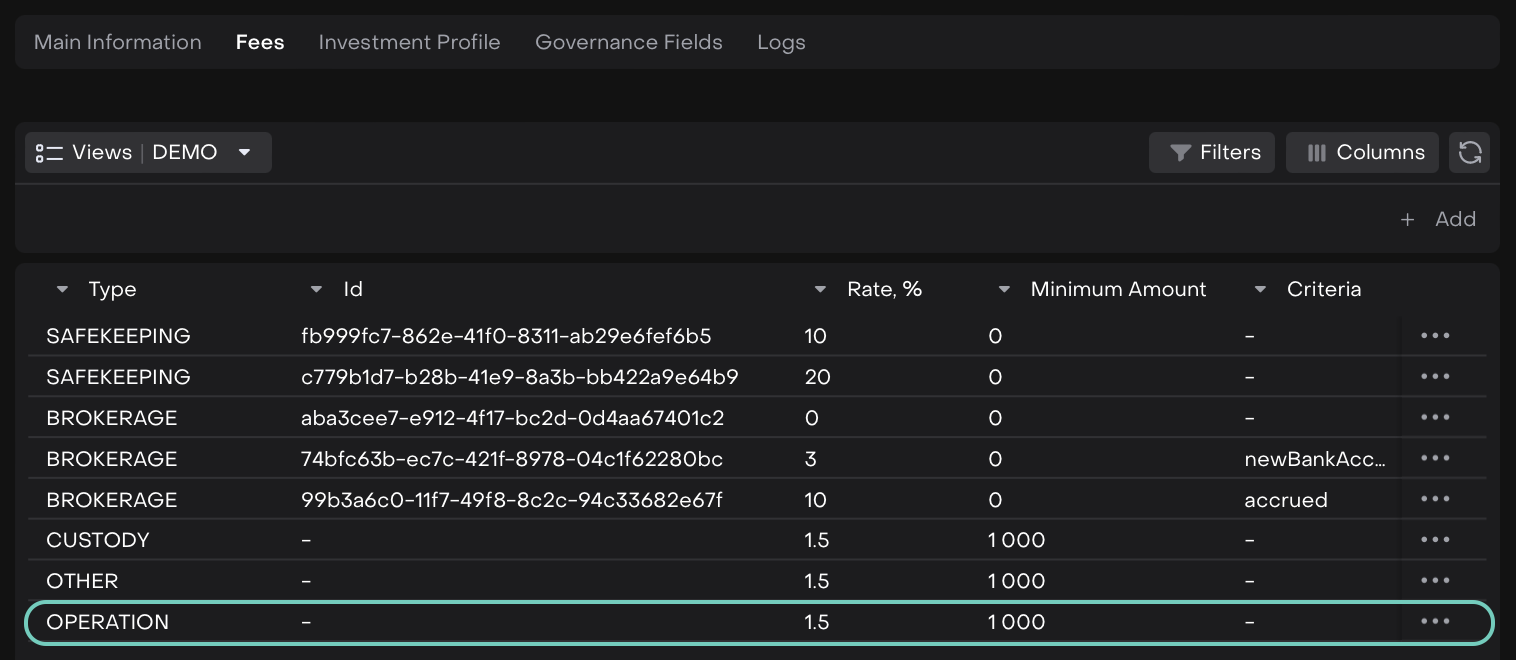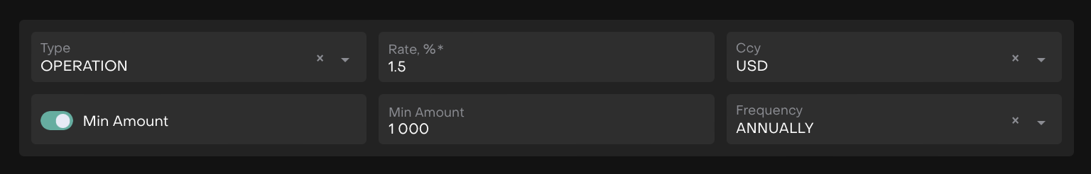 Frequency – Defines how often the fee is applied (e.g., Annually, Monthly, One-time, Quarterly, Semi-Annual).