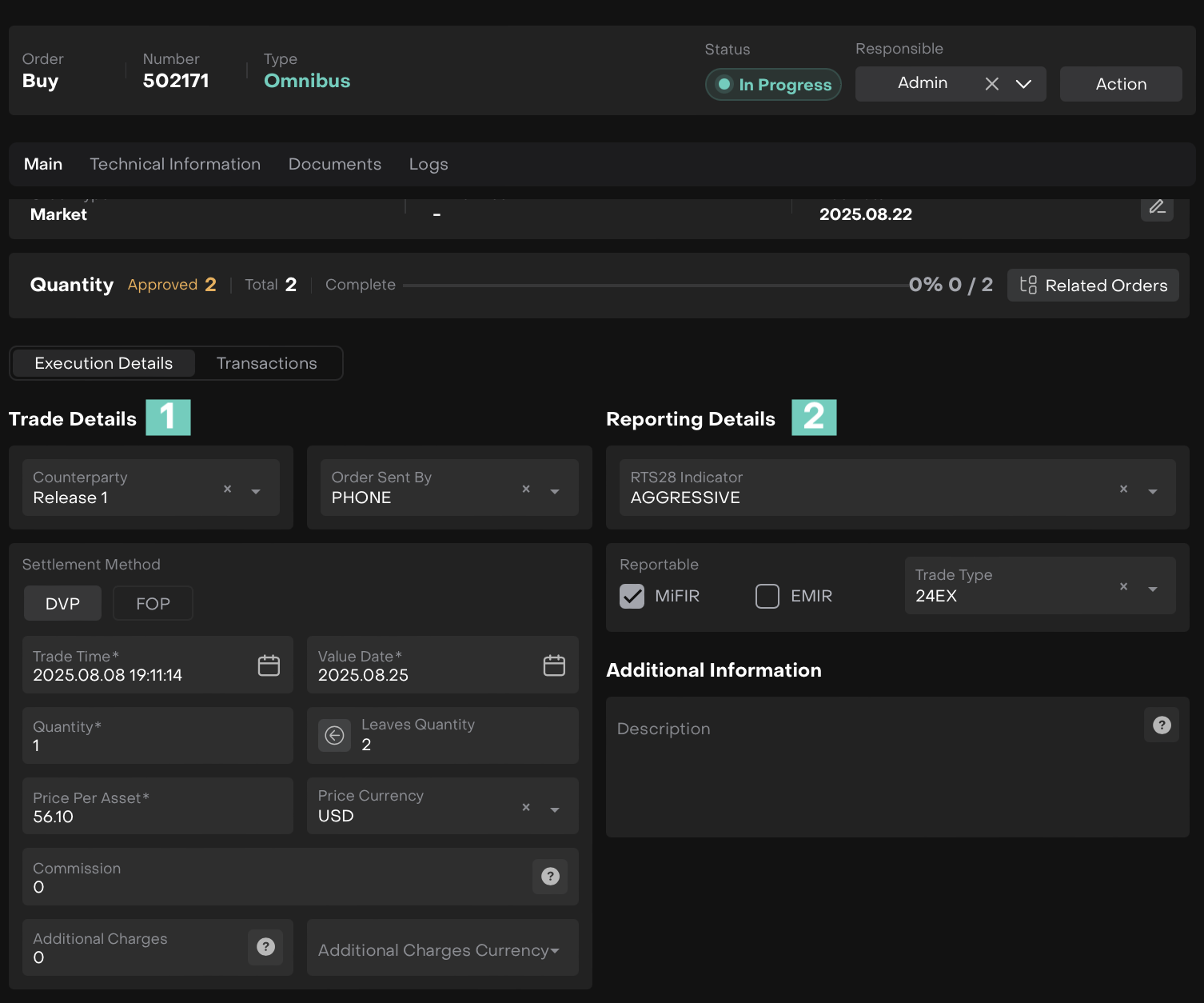 When a Trader opens an omnibus order execution form, the following data is available: