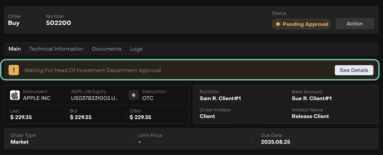 According to Change Request that is set up in the platform, all Client orders can be executed only after approval by HID (Head of Investment Department).
