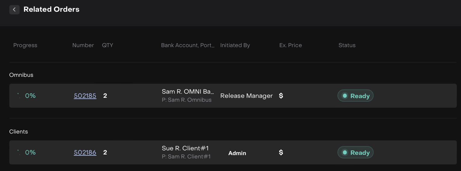 If the Trader sees that the omnibus order is in status “Ready” and Approved Qty = 0, order cannot be executed. Trader can’t work with this order, until there is at least one Client order approved, so that Approved qty is more then “0”.