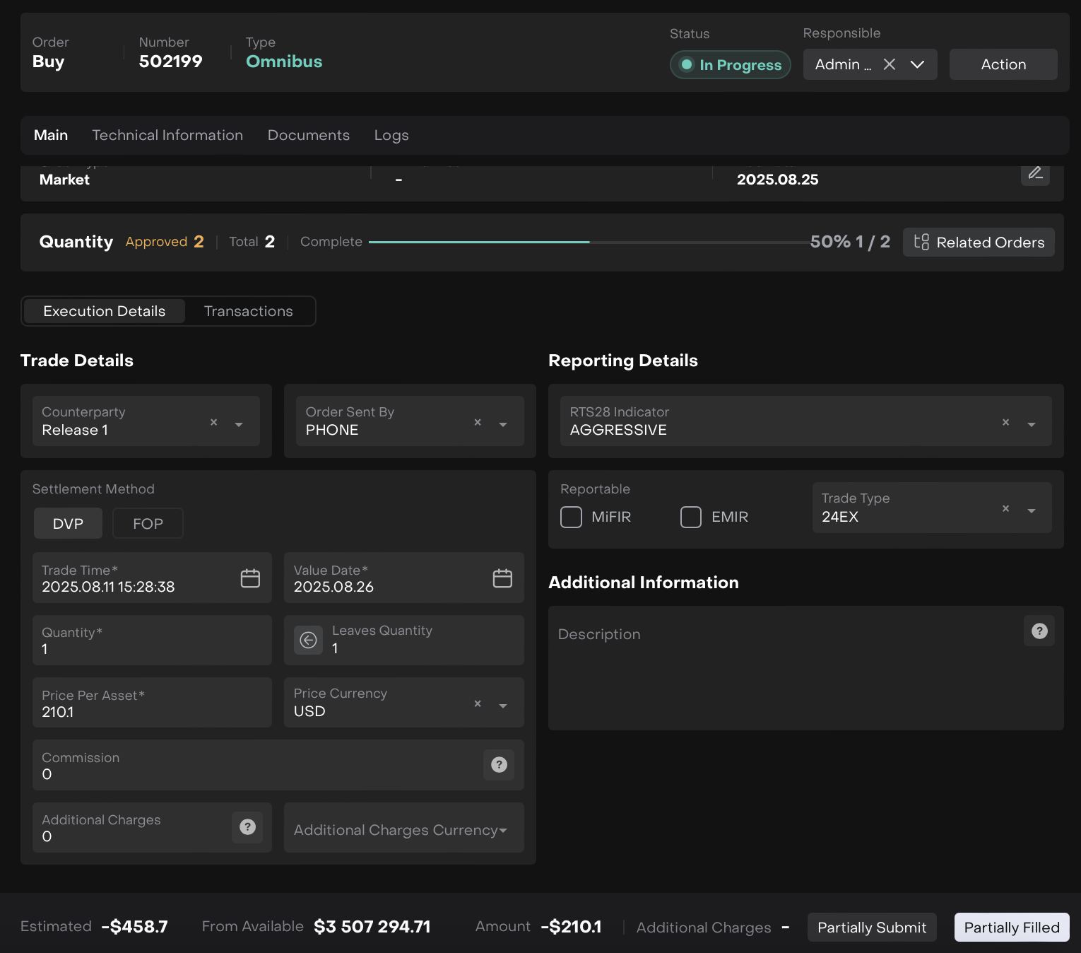 If the Trader waits for further execution, click the "Partially Submit" button.