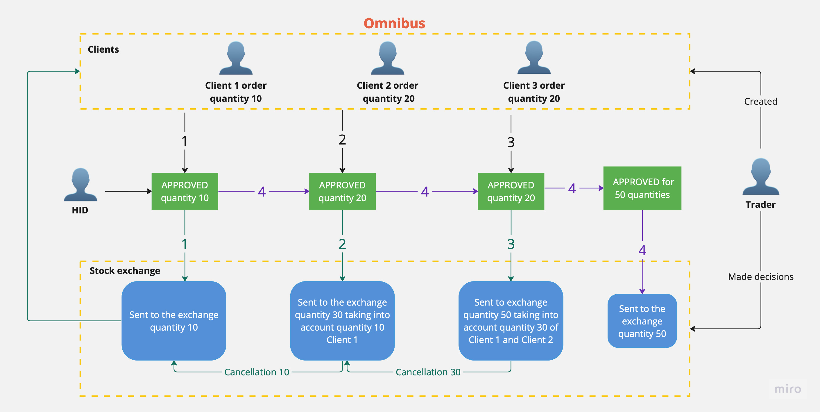 Then HID approves Client Order #2 for a quantity of 20. A Trader sends an order to the exchange. However, Client's #1 ordered for quantity of 10, it had beed canceled and total quantity of 30 had been sent to the exchange.