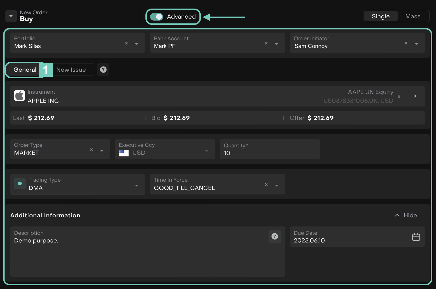 The Reluna platform has an Advanced form of Trading Orders. Advanced form of order gives additional opportunities to Initiator. This form provides additional configuration options, empowering the Initiator to tailor orders beyond the standard setup.