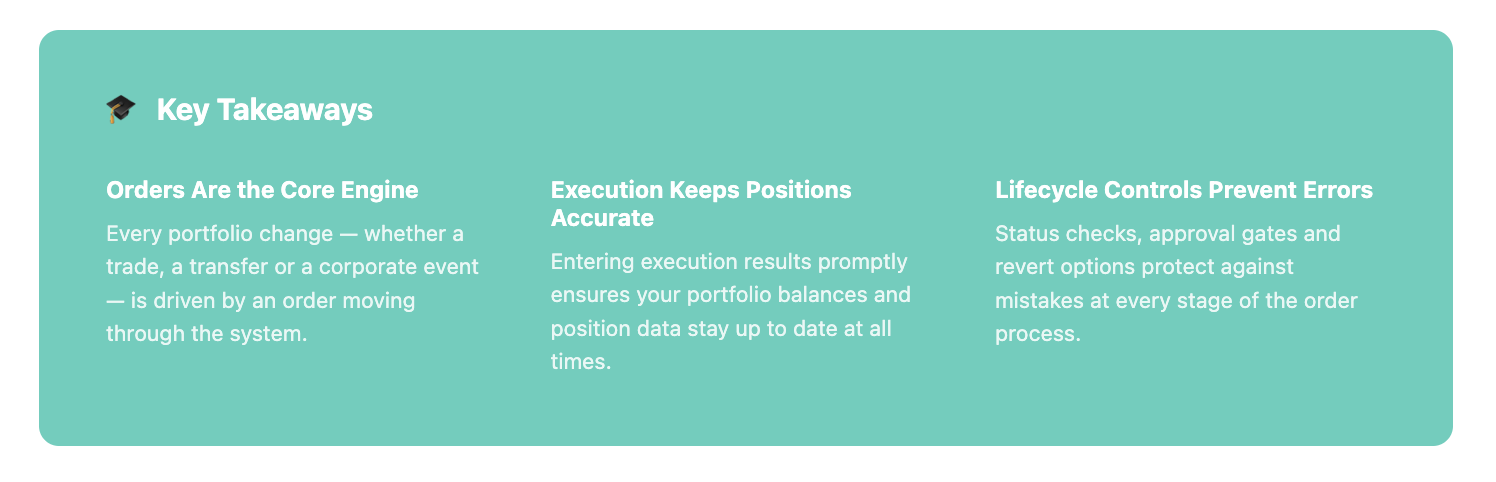 Order execution is the process of accepting and completing an order. You need to enter the execution result on the platform to keep your portfolio positions up to date.