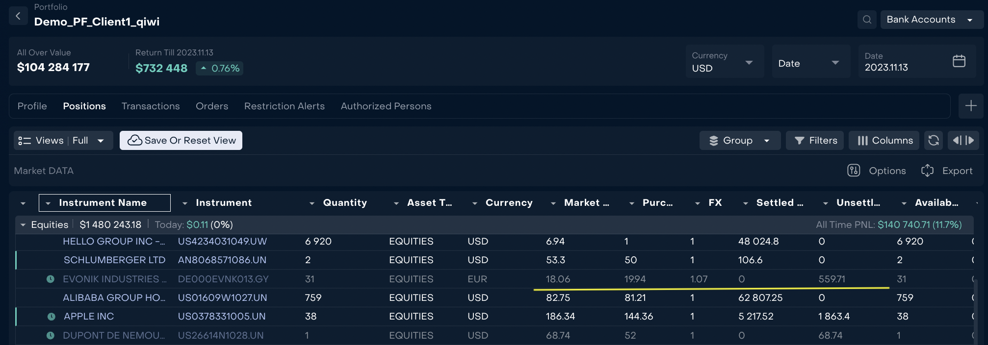 Portfolio positions in Reluna platform are calculated on the basis of transactions. All transactions are linked with orders. Transactions are loaded to the platform via integration with Custodians or via manual import.