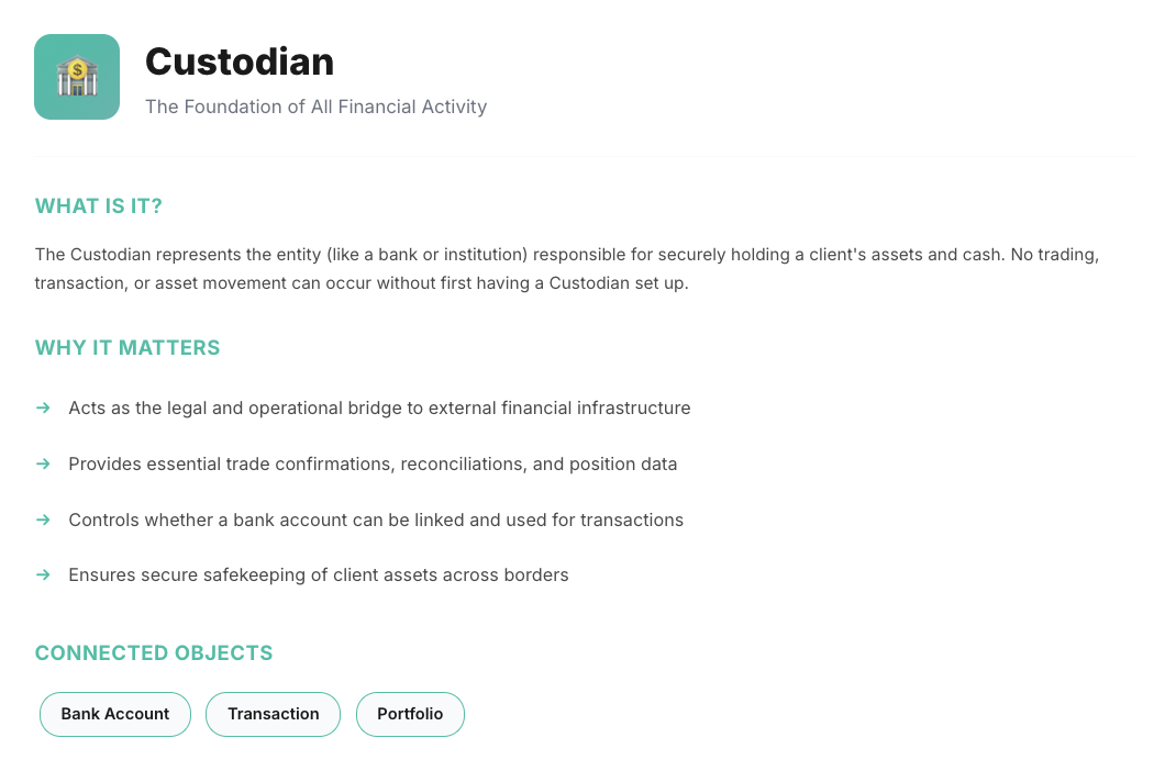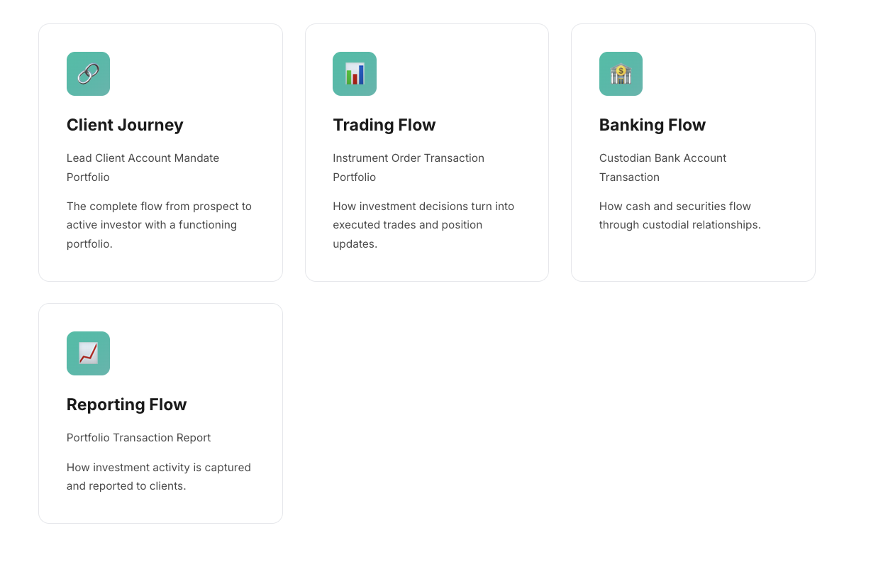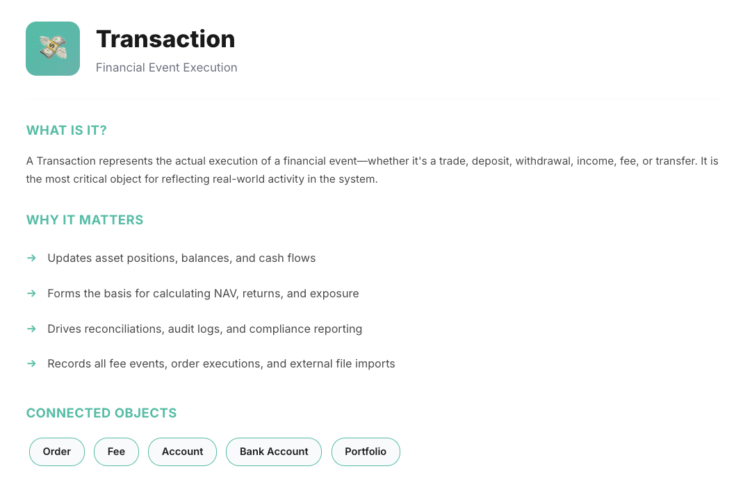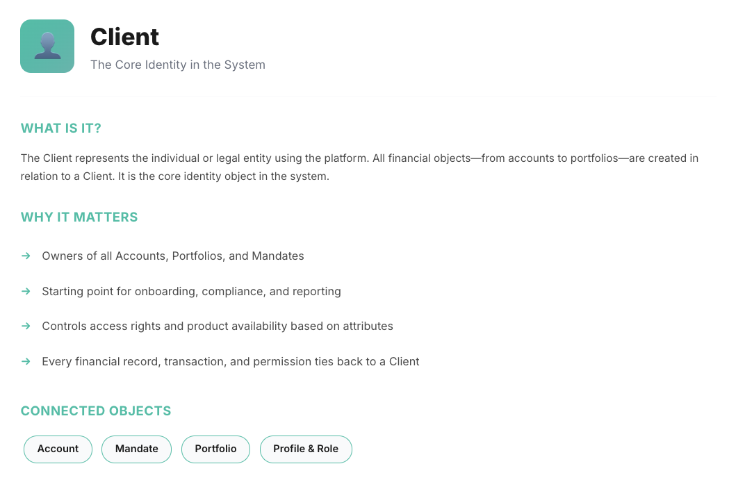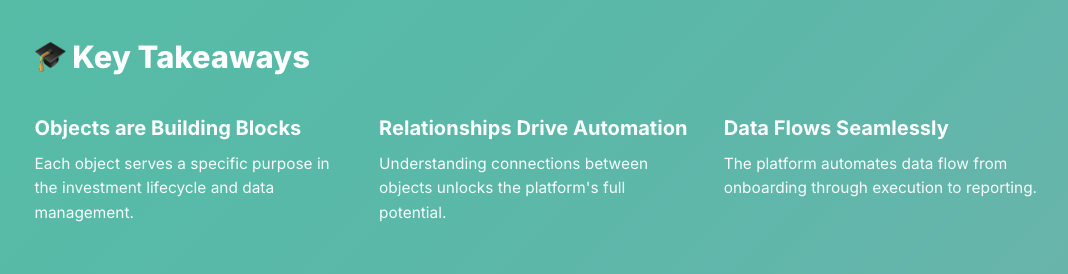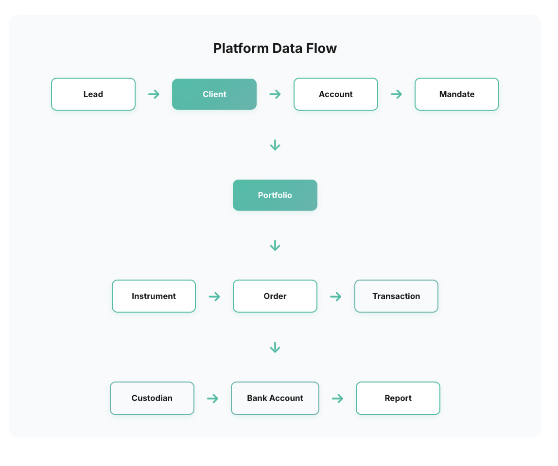 From client acquisition to investment execution, every object plays a critical role in the platform ecosystem.