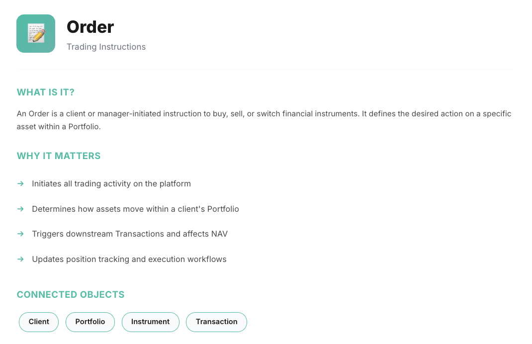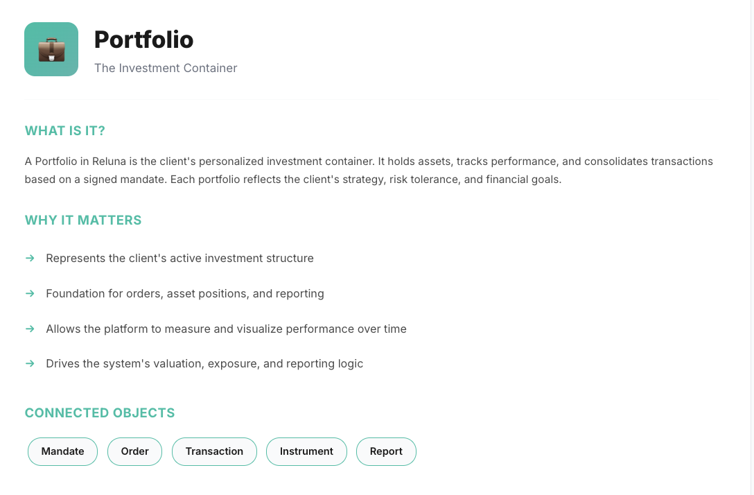 The Reluna platform is built on interconnected objects that work seamlessly together. Each object plays a specific role in managing your investments, from client onboarding to portfolio reporting.