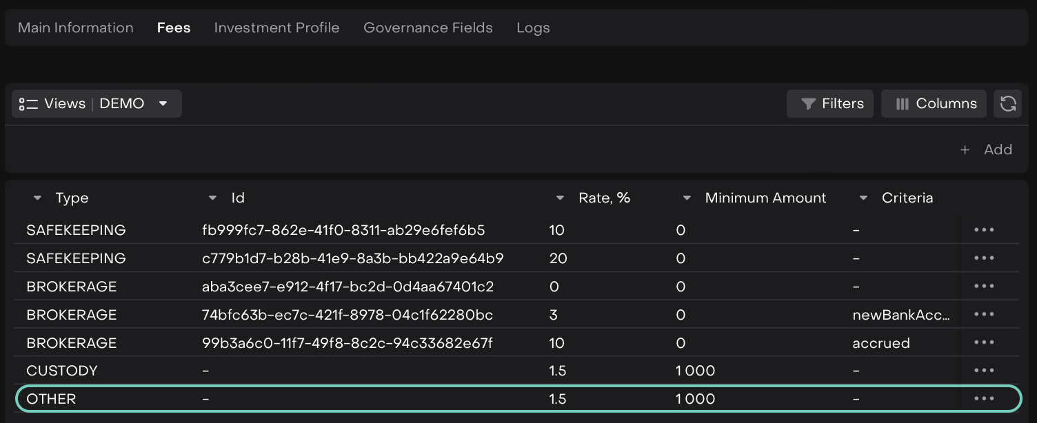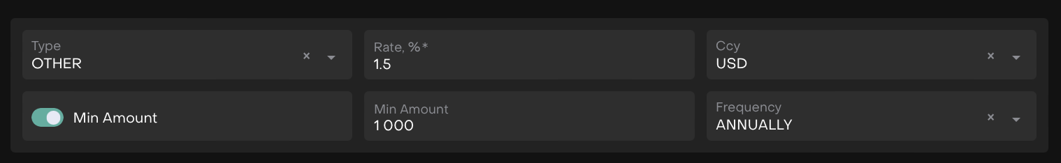 Frequency – Defines how often the fee is applied (e.g., Annually, Monthly, One-time, Quarterly, Semi-Annual).