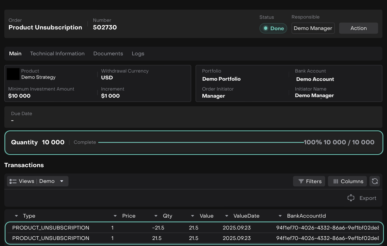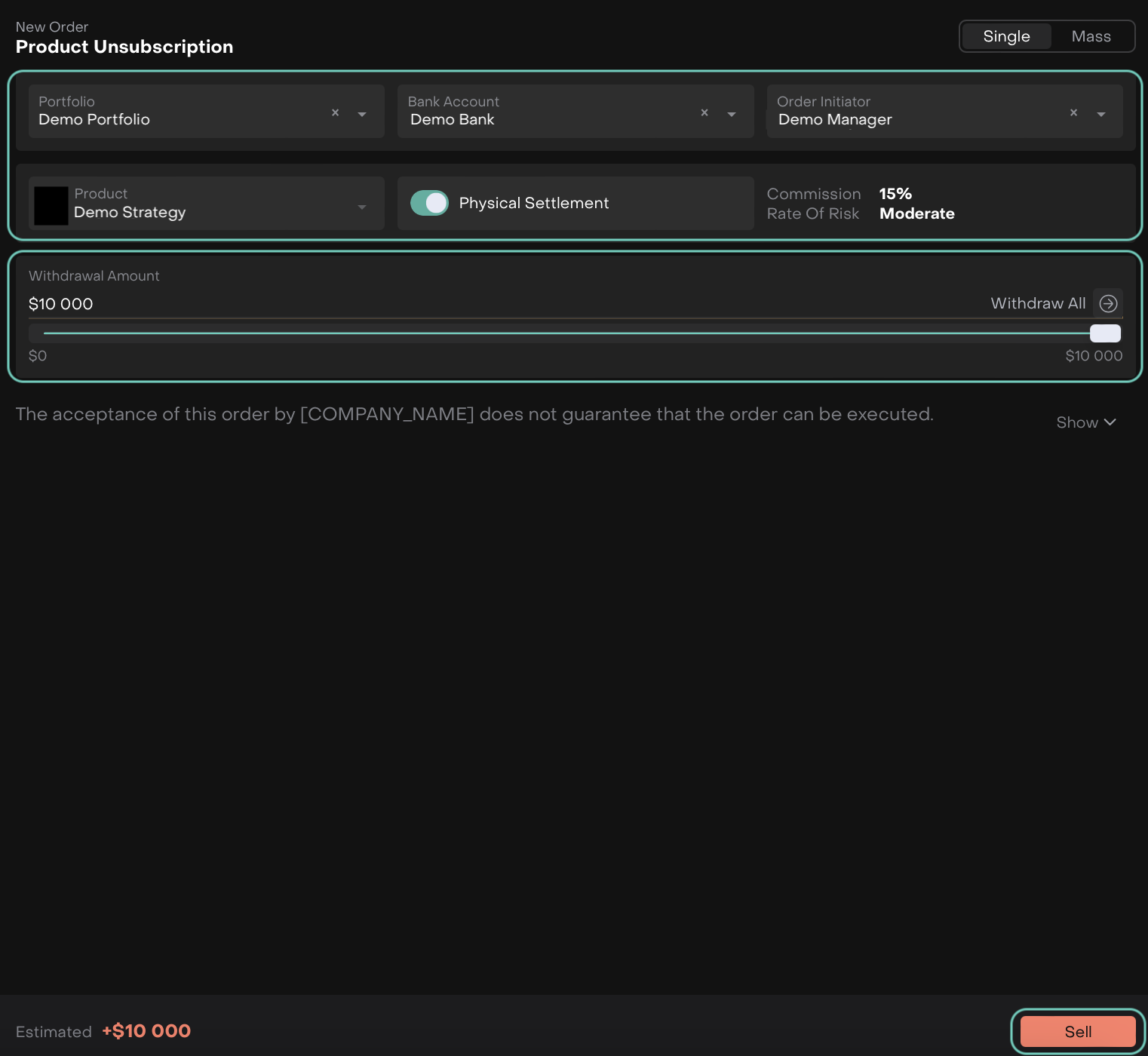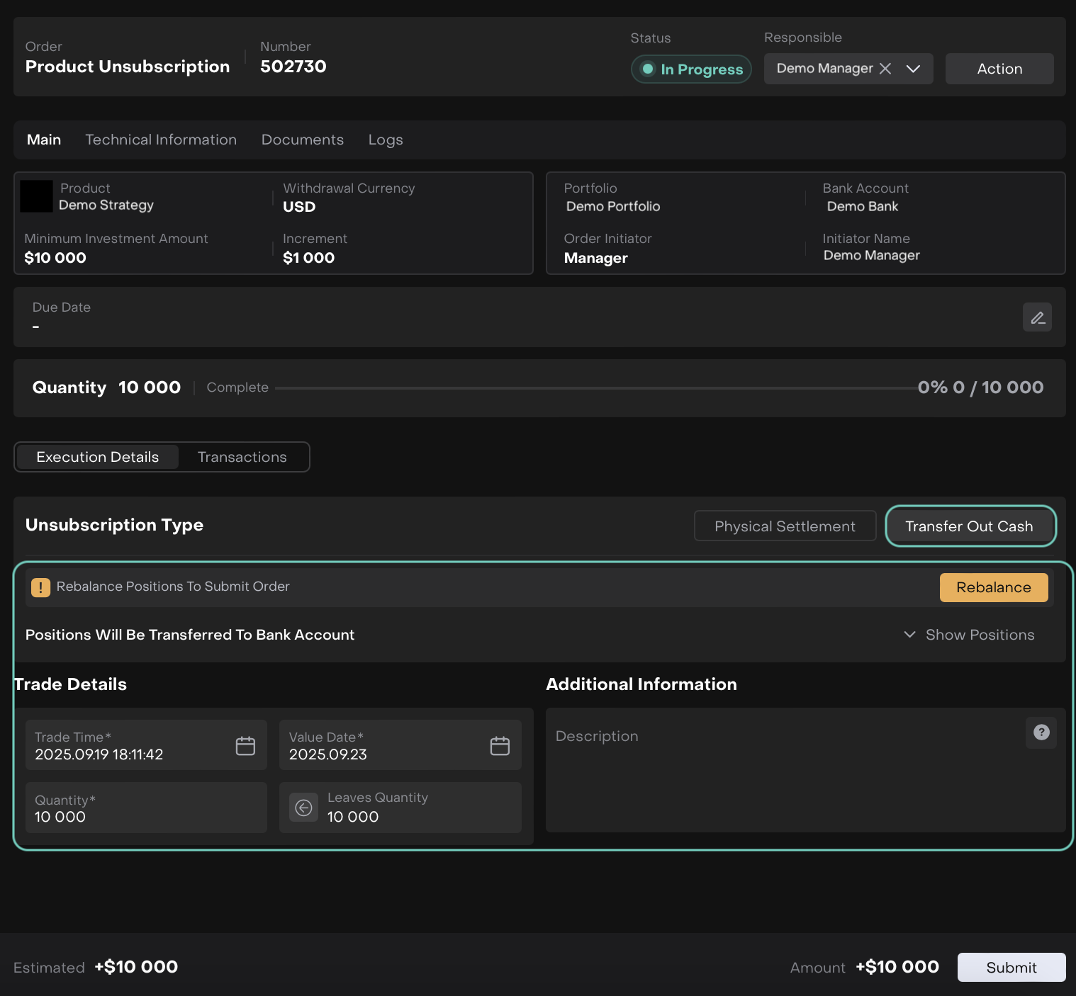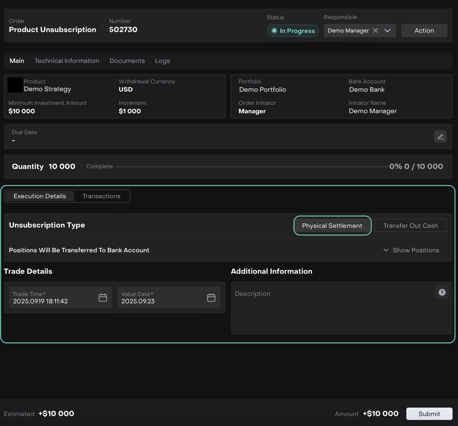 When you unsubscribe from a strategy, you normally redeem your investment as a cash out. However, in some cases, you can choose a physical settlement, where the securities (and/or cash) are transferred directly from the strategy to your main bank account.